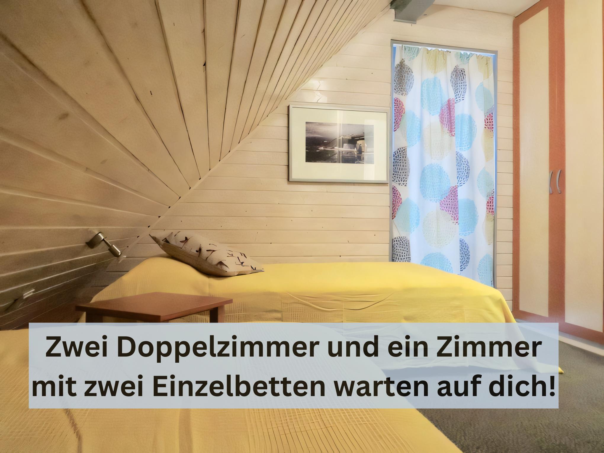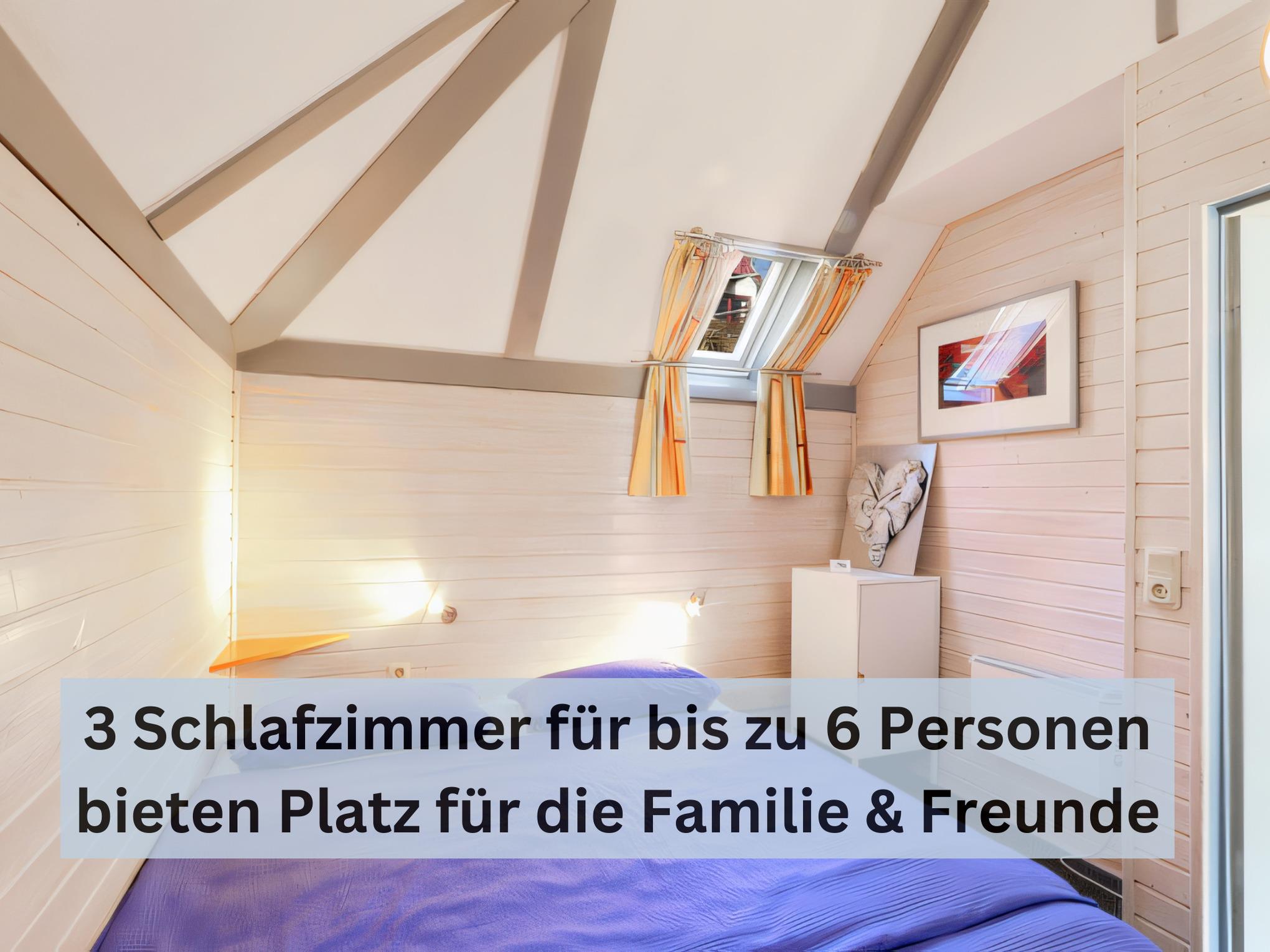 Das Bad und Gäste-WC bieten mit Tageslicht und einem Handtuchheizkörper im Bad den perfekten Ort zur Entspannung. In den insgesamt drei Schlafzimmern mit insgesamt 6 Betten wirst du erholsam schlafen und im Dachgeschoss hast du direkten Zugang auf den Süd-Balkon.