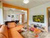 Der Wohnbereich ist mit einem gemütlichen Sofa bestückt. Hier finden alle Gäste einen Platz vor dem großen Flatscreen-TV.
