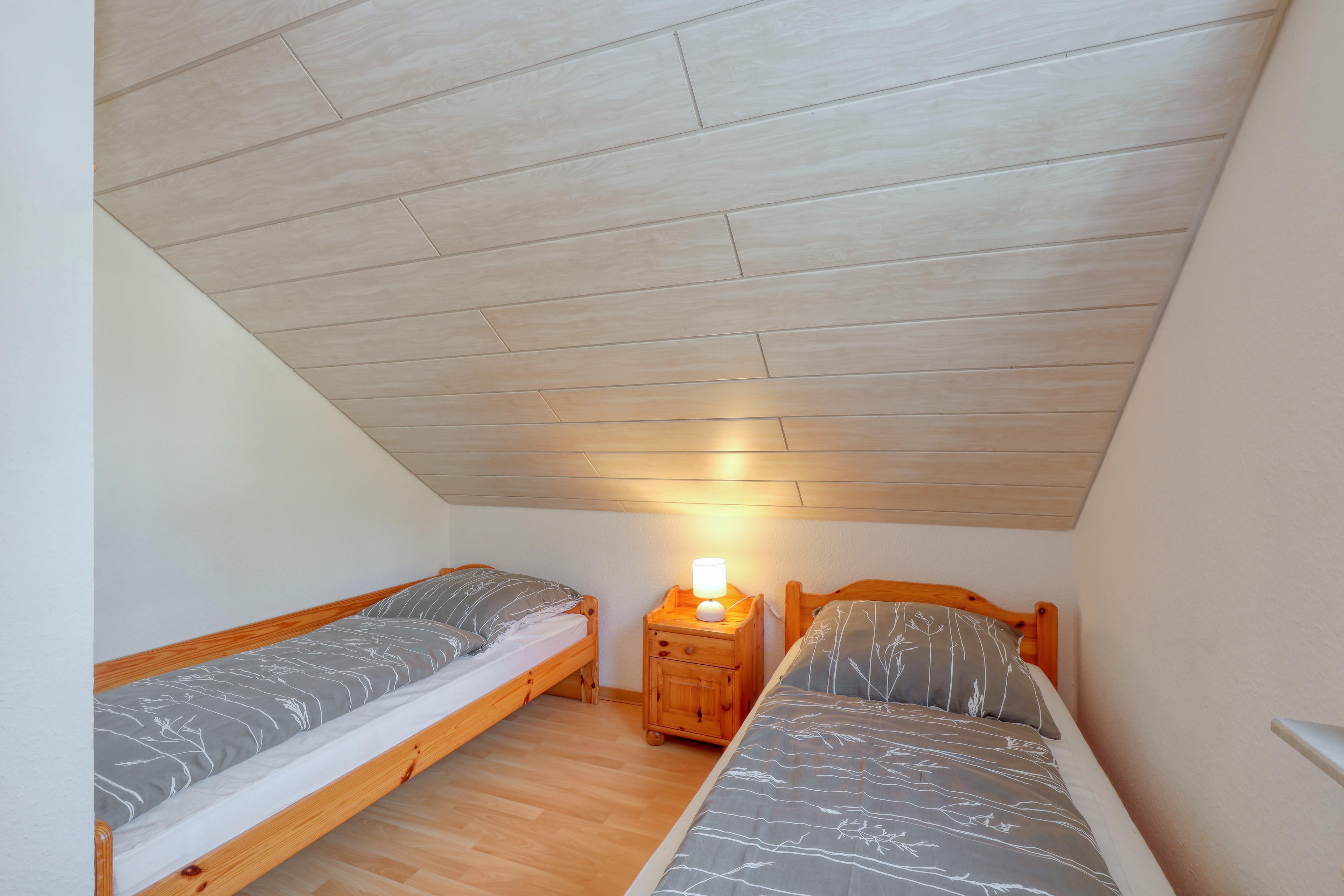 Vier gemütlich eingerichtete Schlafzimmer befinden sich im Obergeschoss des Ferienhauses. Zwei Schlafzimmer verfügen über ein großes Doppelbett mit zwei Einzelmatratzen sowie jeweils ein Waschbecken. Schlafzimmer 3 ist mit zwei Einzelbetten ausgestattet. Schlafzimmer 4 ist zur Alleinnutzung mit einem Einzelbett.