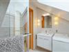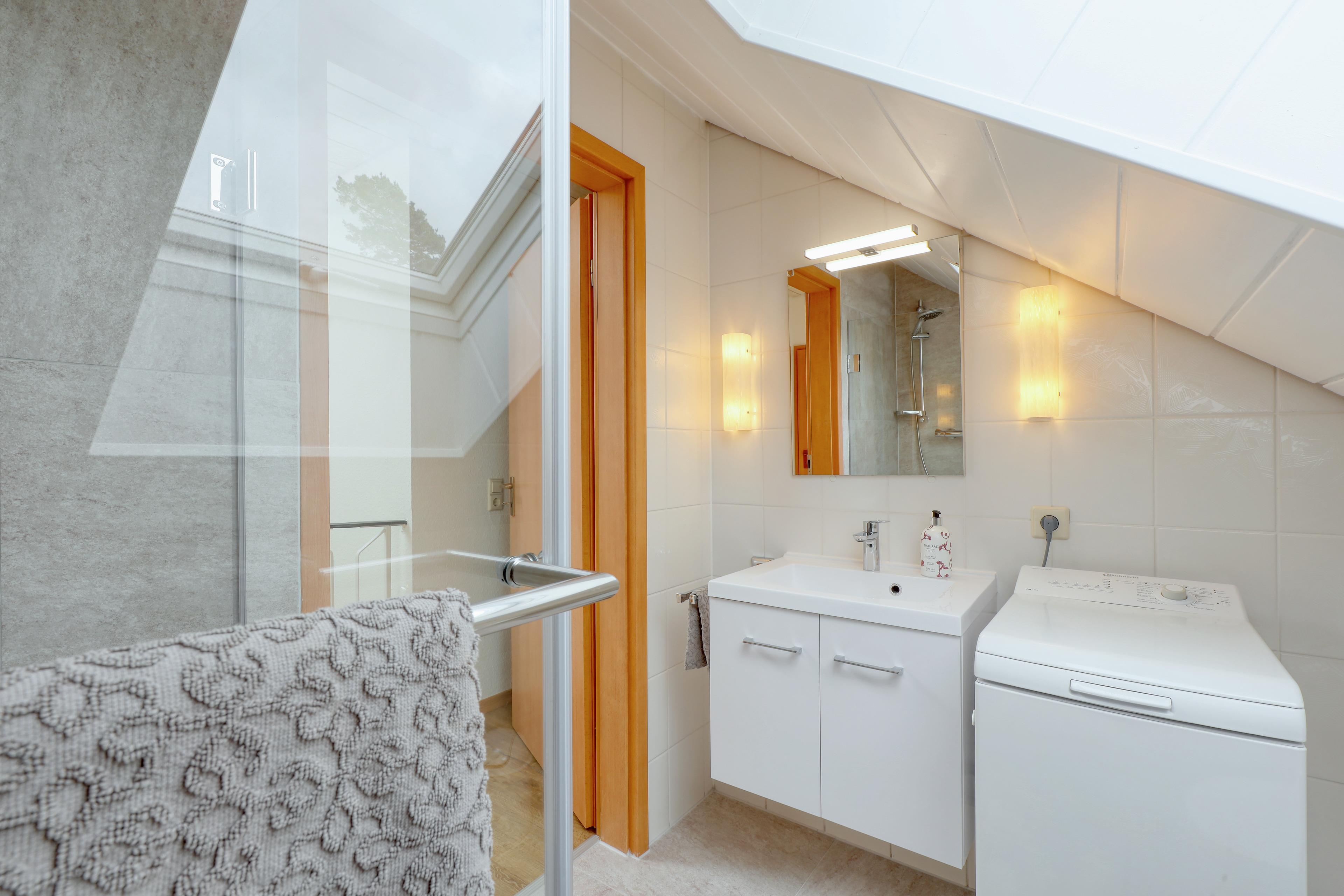 Zwei Bäder sind Bestandteil des Ferienhauses. Beide sind mit Dusche und WC ausgestattet. Badezimmer 1 befindet sich im Erdgeschoss, Badezimmer 2 mit Waschmaschine im Obergeschoss.