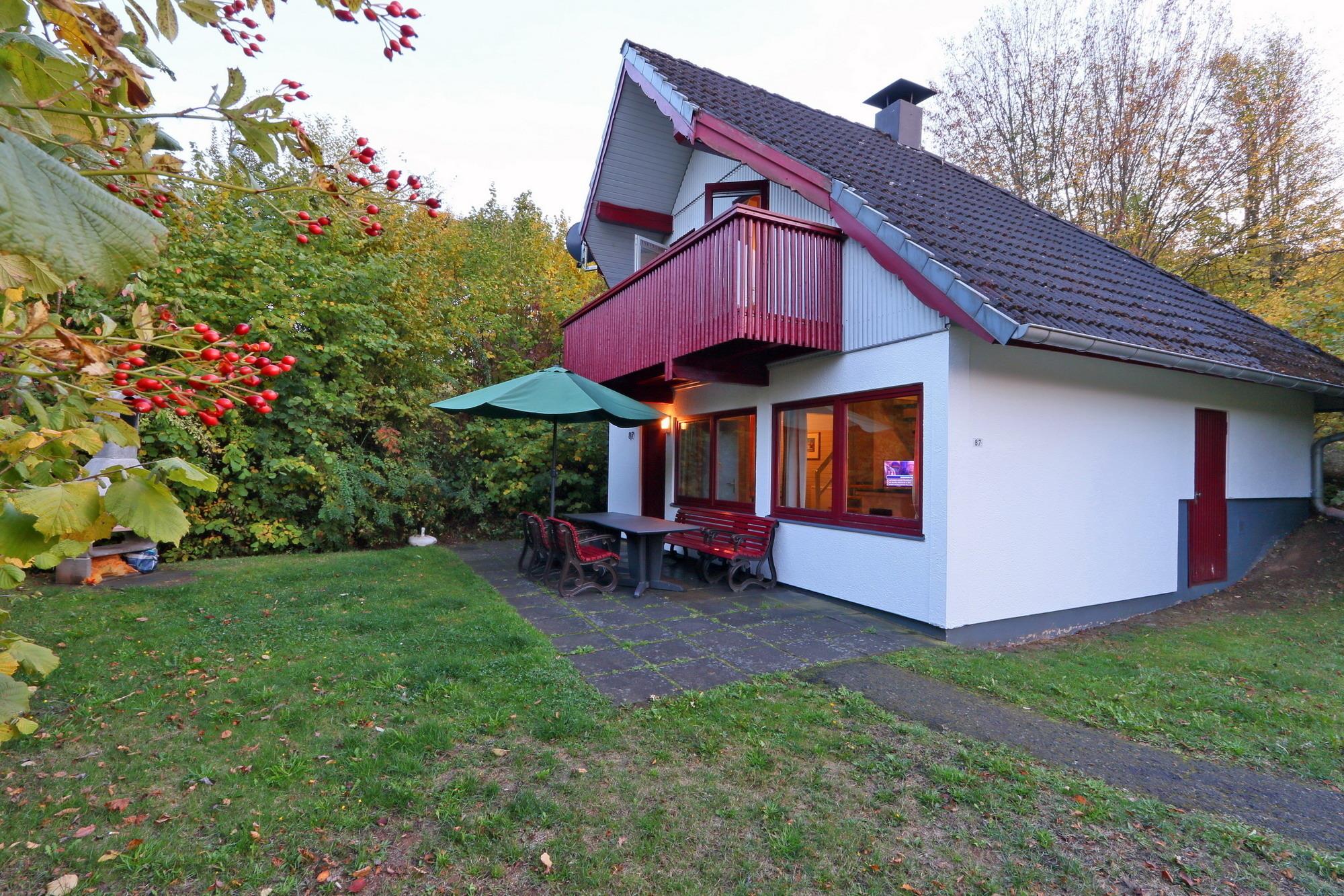 Von dem Balkon aus können Sie die Aussicht in den Wald und die Landschaft vom Hessischen Bergland genießen.