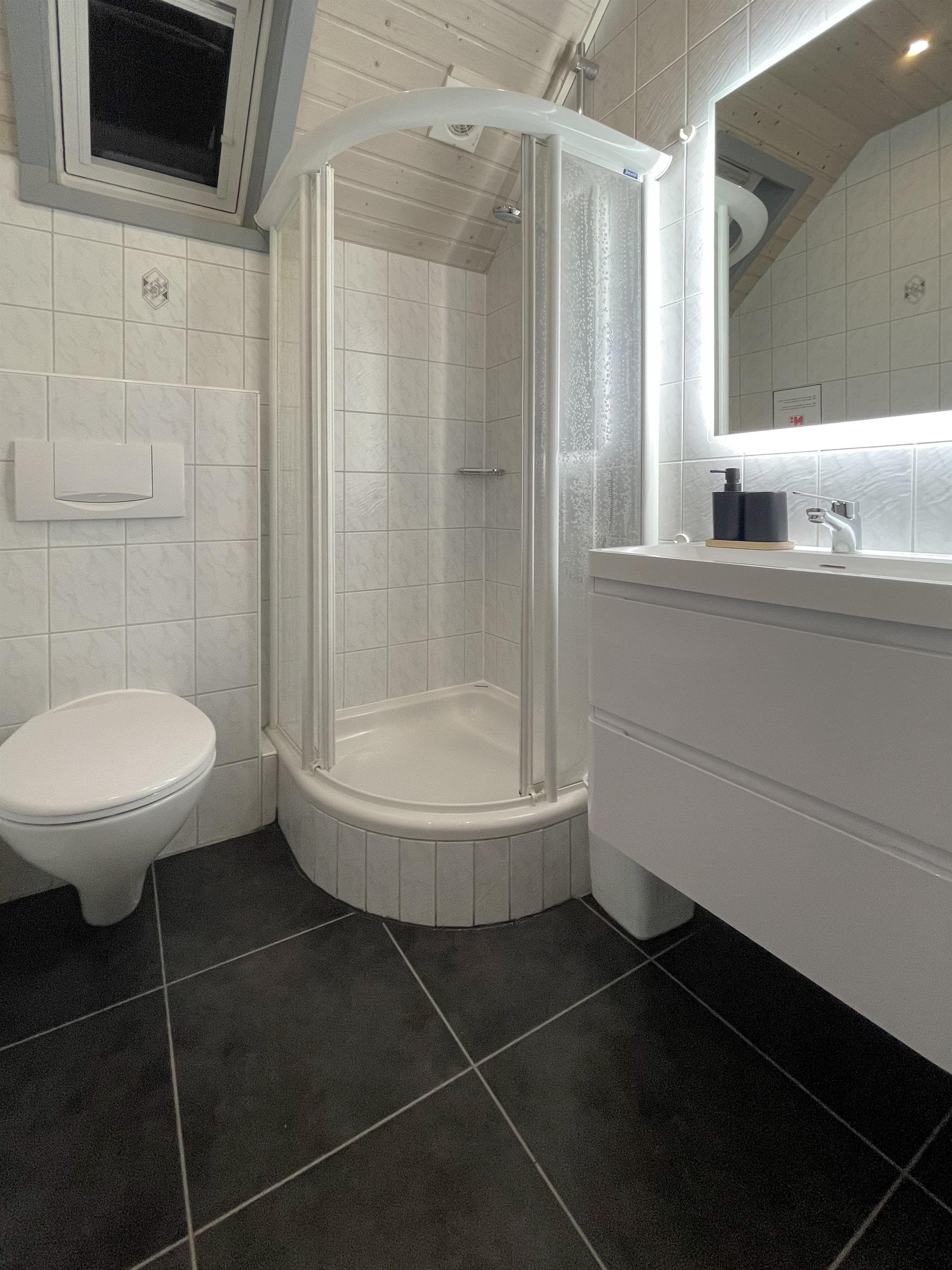 Im Erdgeschoß befindet sich der Eingang mit Windfang und Garderobe sowie der großzügige Wohnraum mit Kamin. Von dort gelangt man auf eine schöne Empore mit Küche, Bad sowie einem Gäste-WC und einem Schlafraum mit Doppelbett.