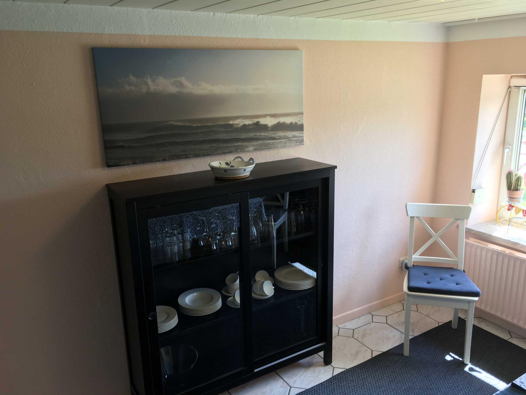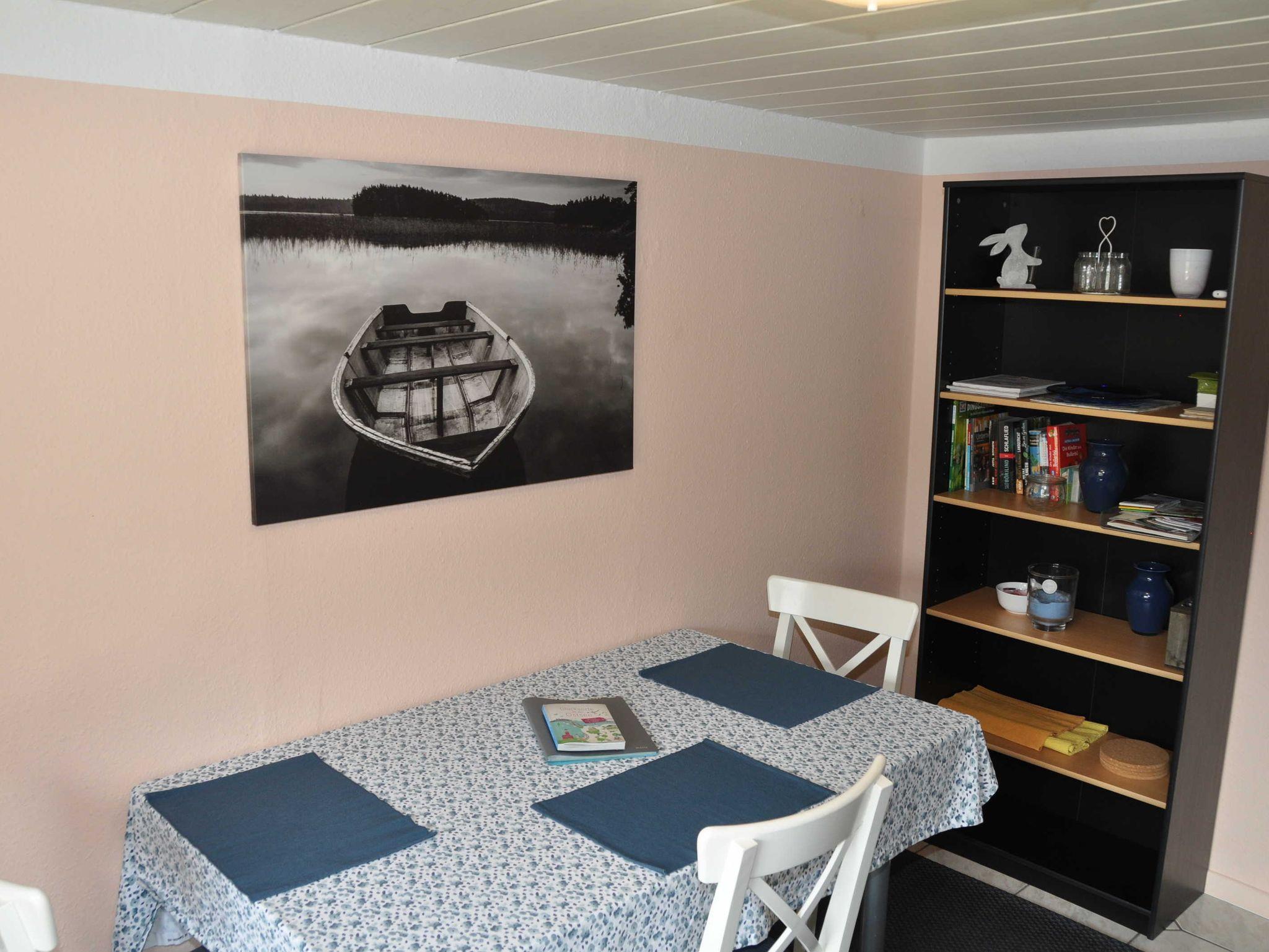 • Esszimmer: Tisch mit 4 Stühlen, Regal, Vitrine und Radio