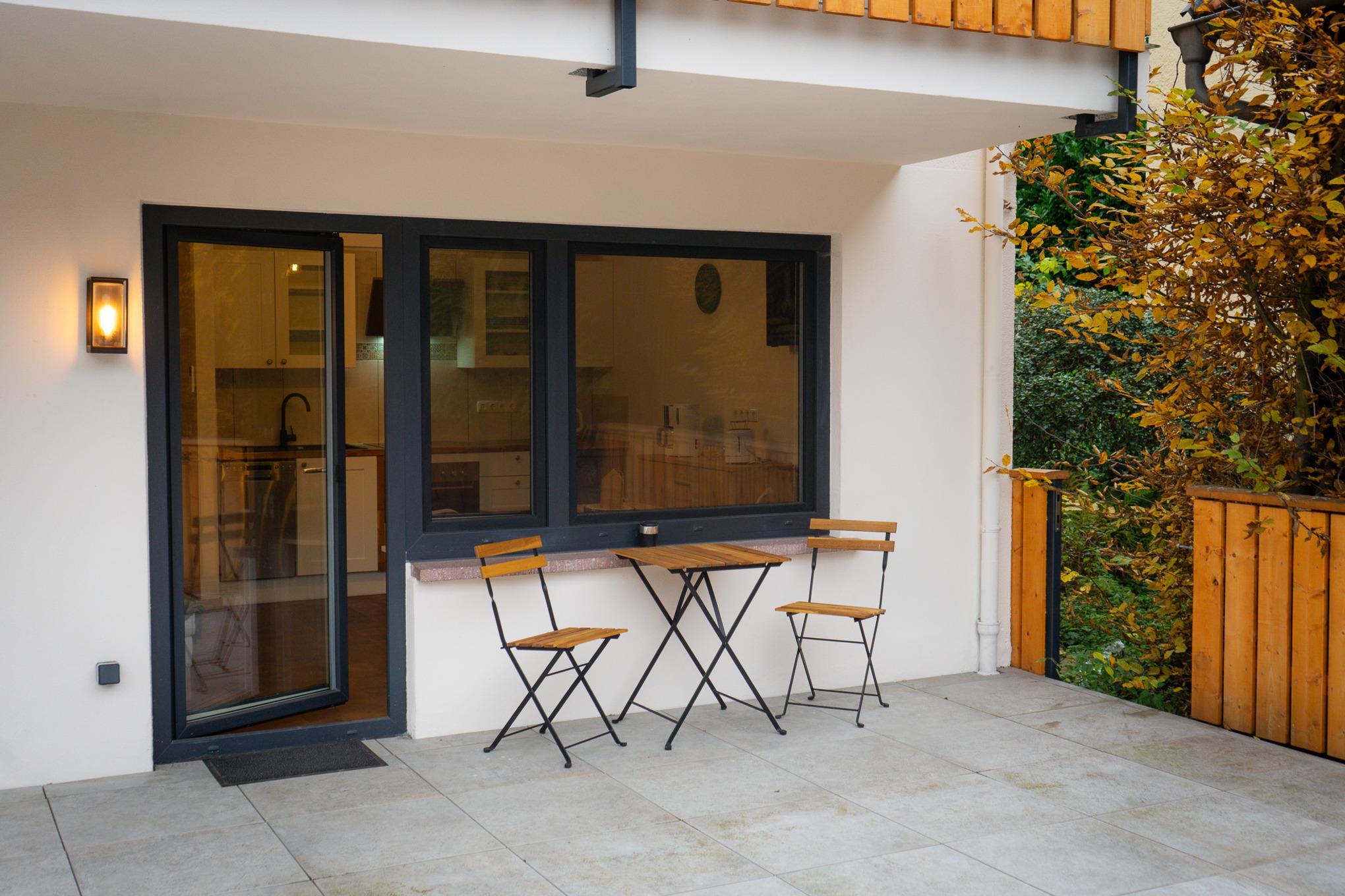 Für den abendlichen Schlummertrunk ist die schöne Terrasse ideal. Die gut ausgestattete Küche besitzt unter anderem einen Kühlschrank, einen Herd zum Kochen und sogar eine Spülmaschine.
