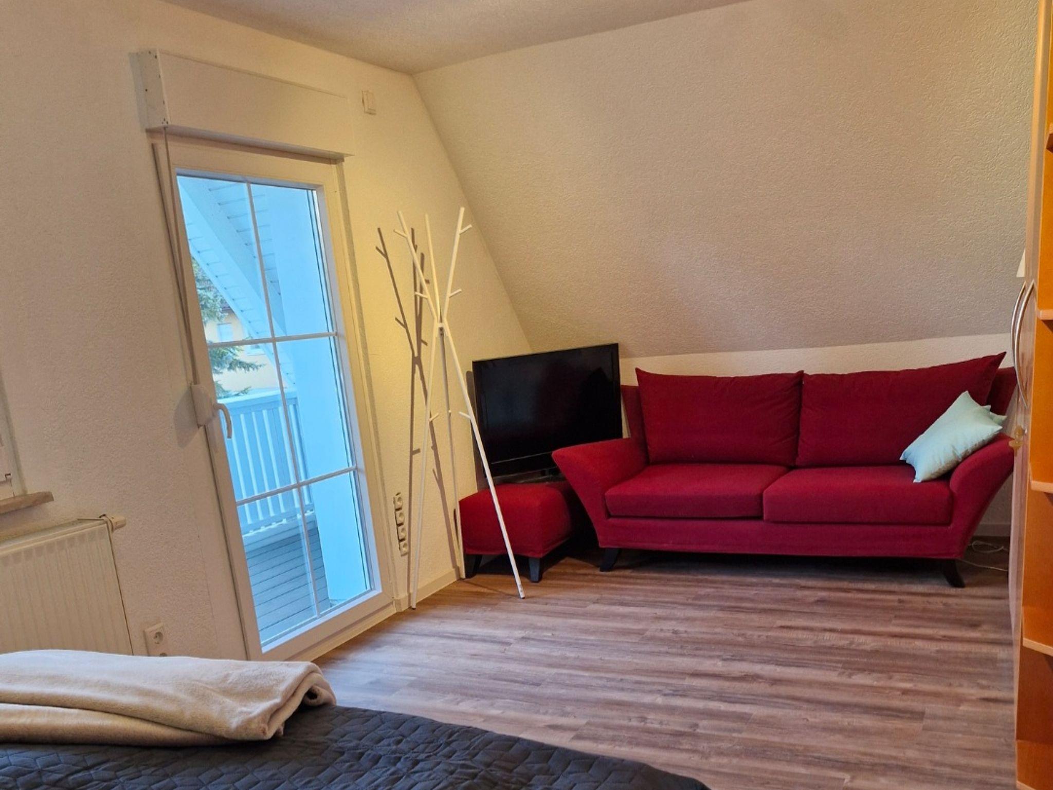 Die Ferienwohnung verfügt über 1 Schlafzimmer mit einem Doppelbett, Sofa, Schrank und einem Zugang zum Balkon.