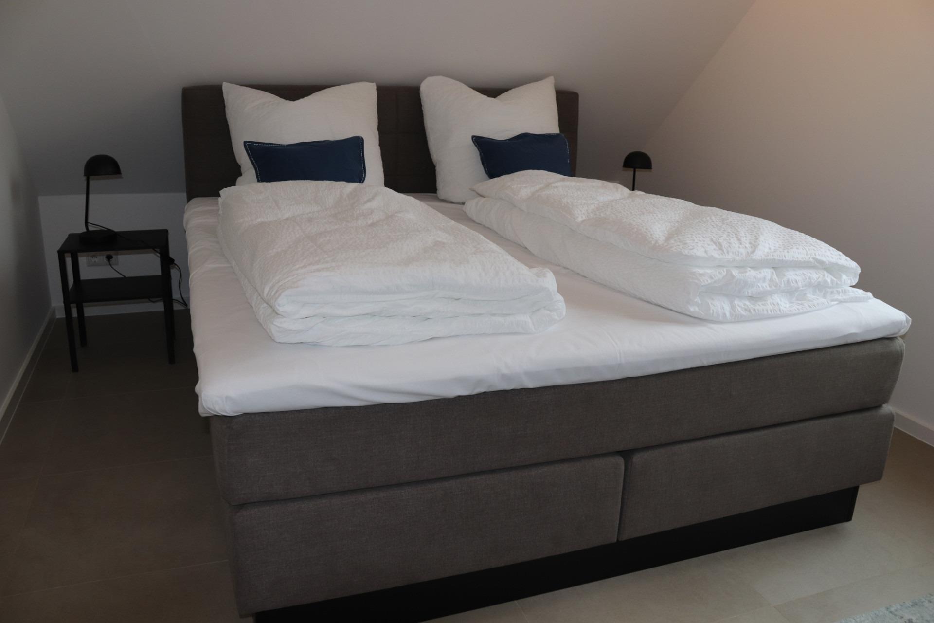 Die drei liebevoll gestalteten Schlafzimmer, zwei davon mit luxuriösen Boxspringbetten in 1,80 x 2,00 Meter und eines mit zwei gemütlichen Einzelbetten, die zusammen geschoben werden können, sorgen für erholsame Nächte. Jedes Schlafzimmer sowie das Wohnzimmer sind mit modernen Flatscreen-TV-Geräten ausgestattet. Zwei moderne Badezimmer mit bodengleichen Duschen lassen keine Wünsche offen.