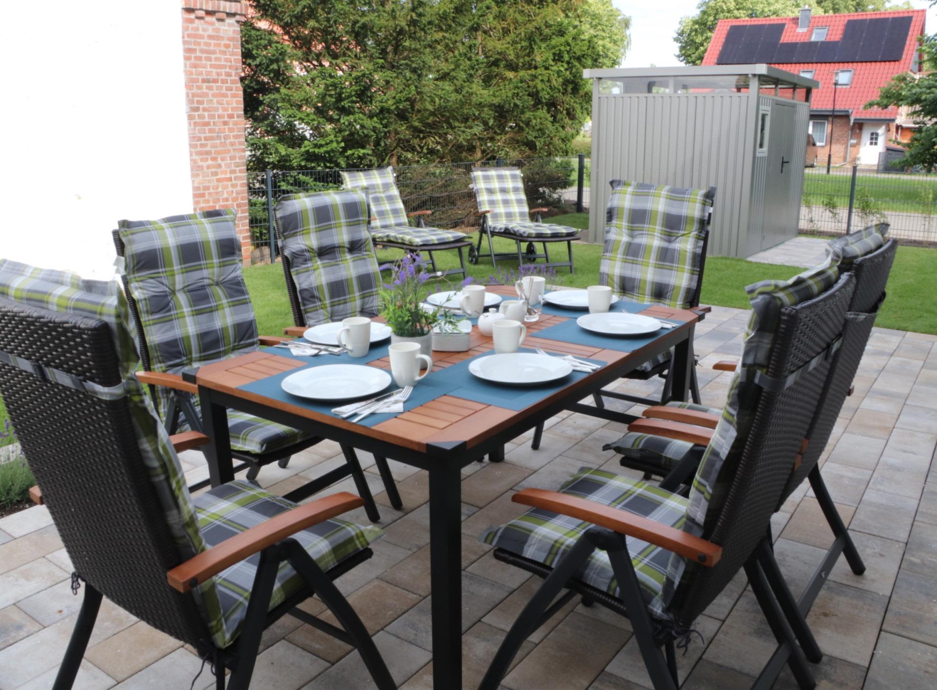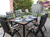 Die Terrasse ist mit hochwertigen Möbeln ausgestattet: Sechs Stühle mit Polster sowie zwei gemütliche Gartenliegen mit Polstern laden zum Verweilen und Entspannen ein.