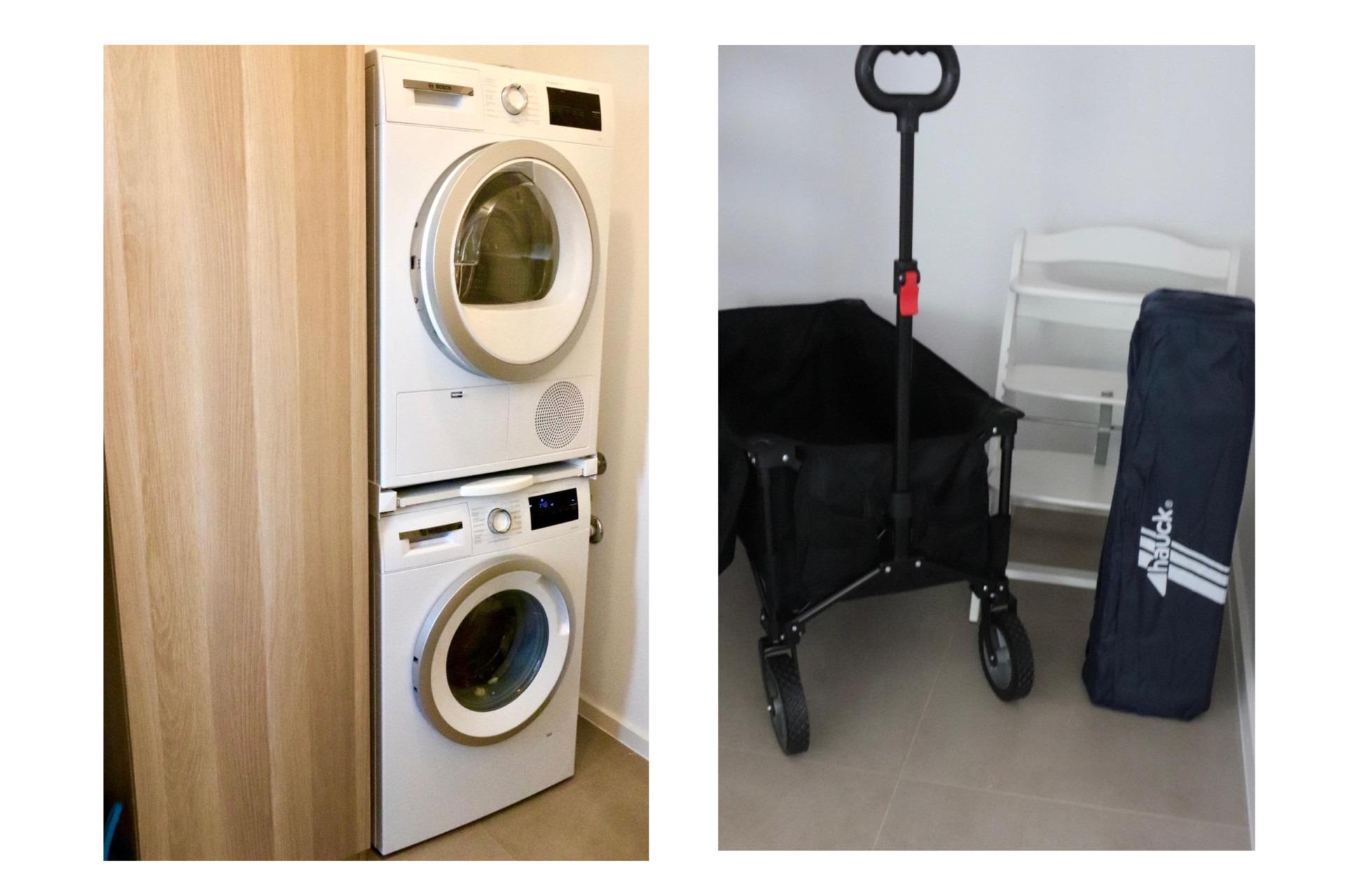 Für zusätzlichen Komfort stehen eine Waschmaschine, ein Trockner und ein Wäscheständer zur Verfügung.