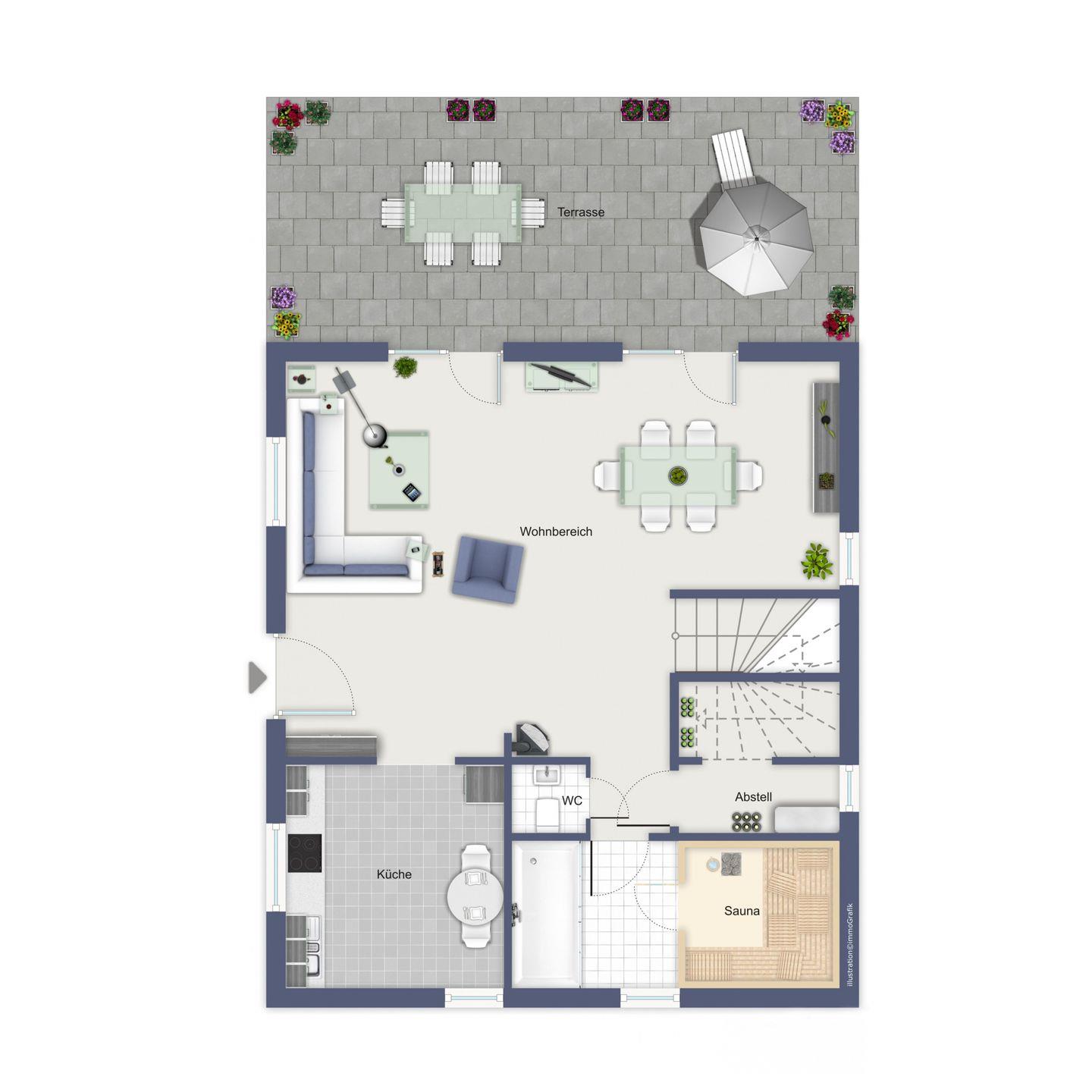 Besondere Erholung bietet die hauseigene Sauna im Erdgeschoss des Ferienhauses (5,00 € für 2 Stunden Laufzeit). Eine Dusche sorgt für Erfrischung. Das Gäste-WC befindet sich neben dem Saunabereich.