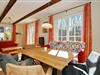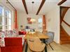 Im Erdgeschoss des Ferienhauses befindet sich der Wohnbereich. Hier laden eine Eckcouch und ein Sessel zu geselligen Abendstunden ein. Zur Unterhaltung stehen ein Flatscreen-TV, ein DVD-Player sowie eine Stereoanlage bereit. Der Essbereich ist im lichtdurchfluteten Wohnbereich integriert und bietet viel Platz für gemeinsame Mahlzeiten. Der Kamin sorgt besonders an kälteren Abenden für Gemütlichkeit und wohlige Wärme. Auf die sonnenverwöhnte Terrasse gelangst du vom Wohnbereich aus.