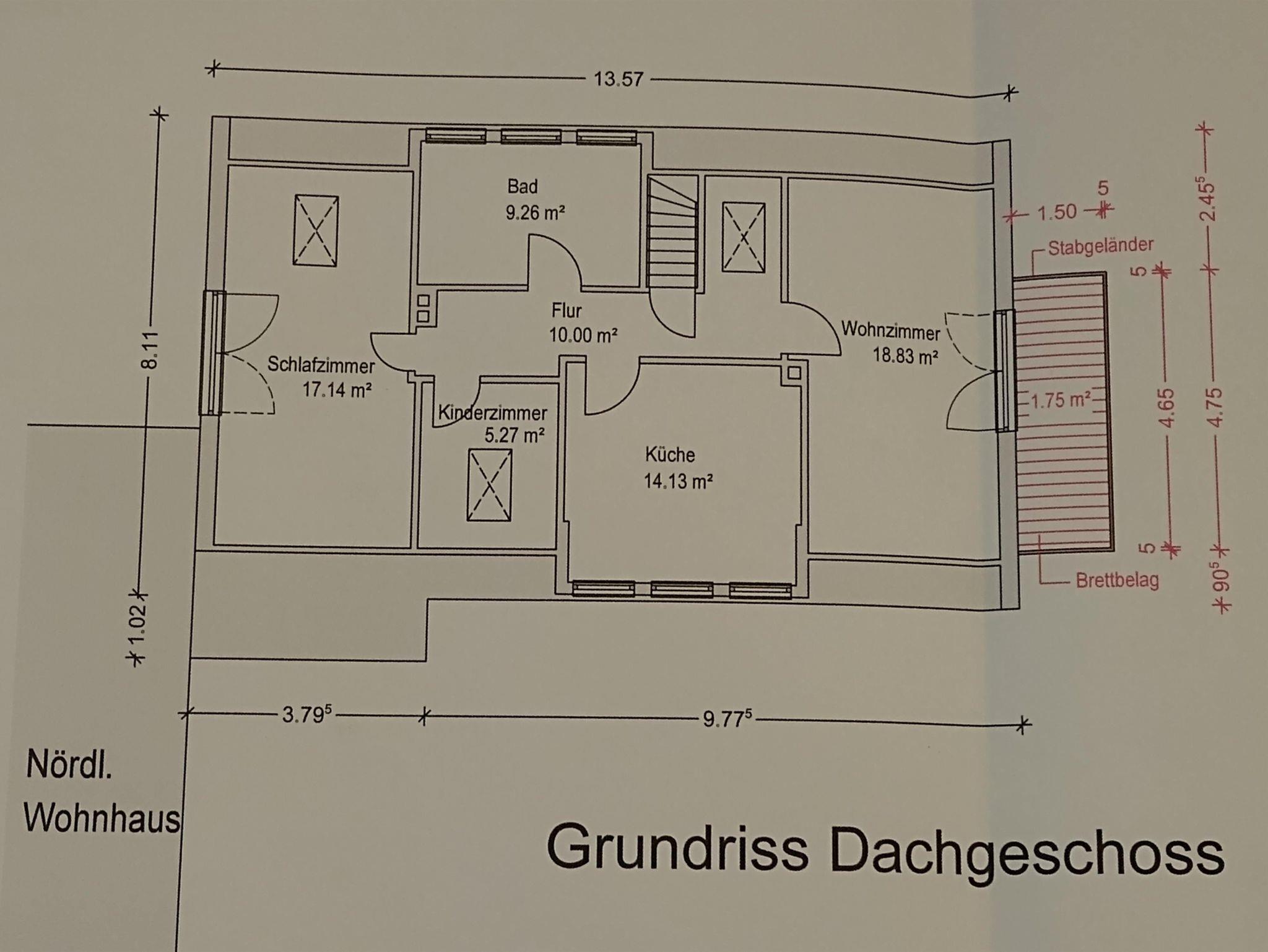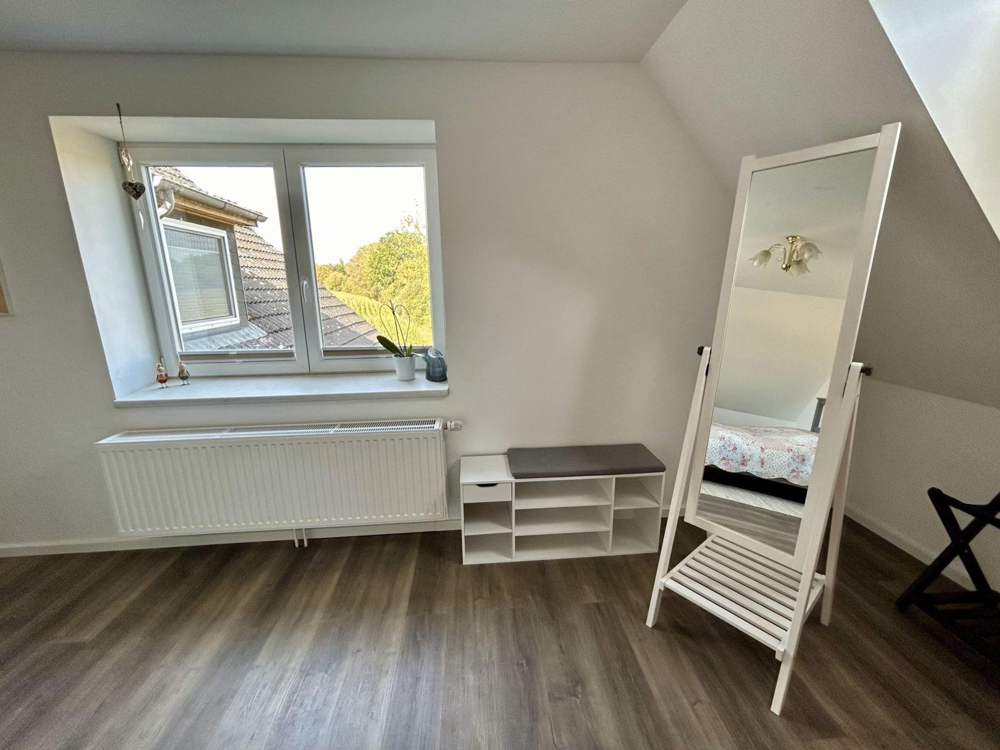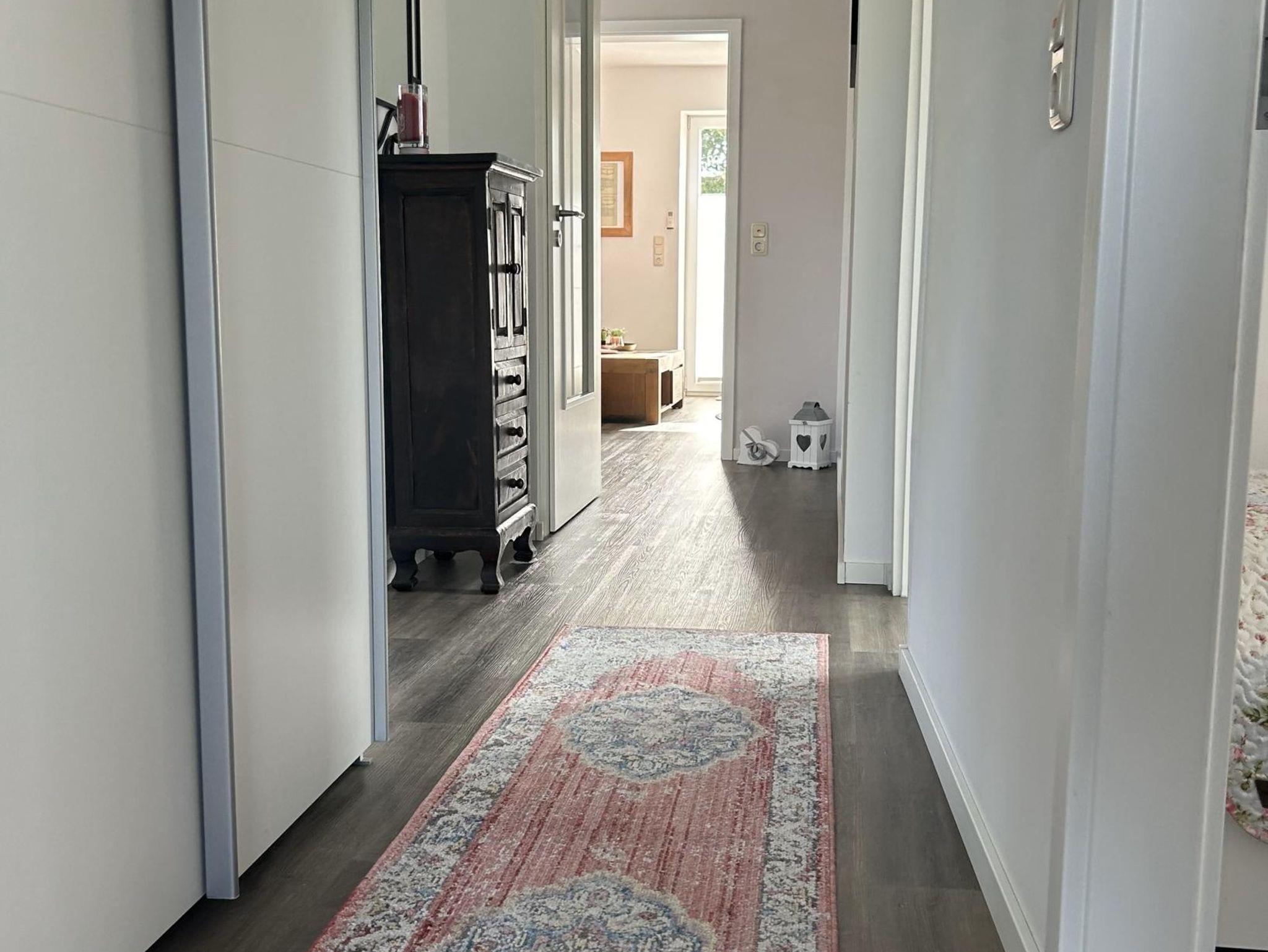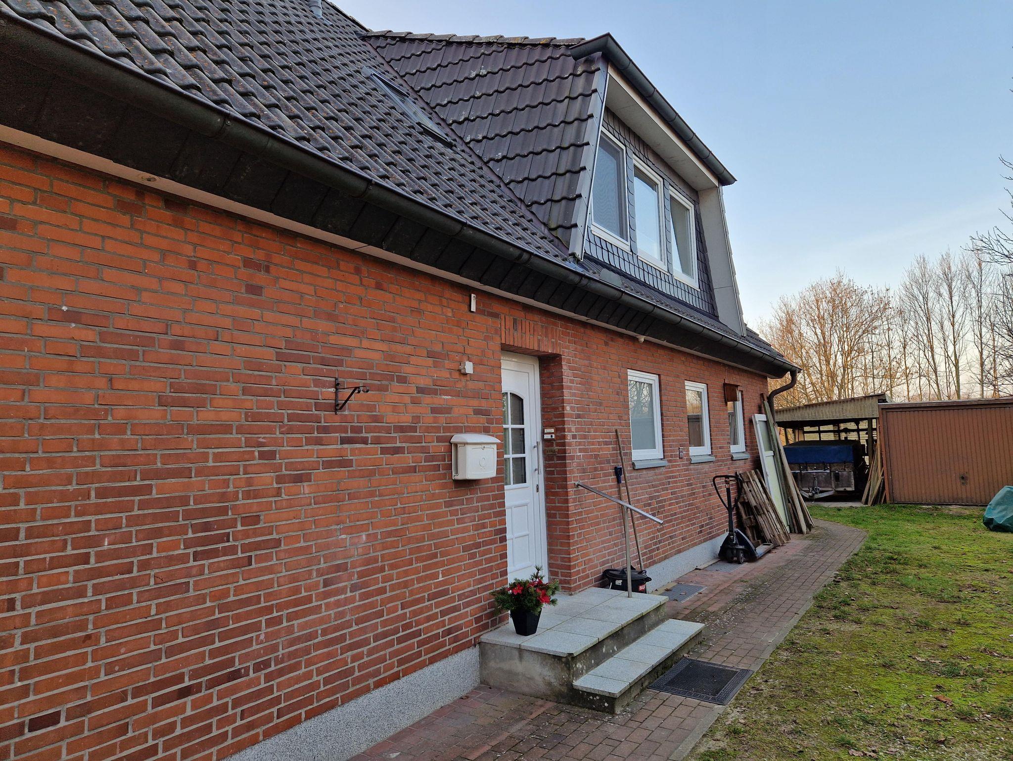 Die Wohnung befindet sich im Gebäude auf der rechten Seite im Obergeschoss (1. Foto). Im Eingangsbereich auf der Rückseite des Hauses führt eine Treppe durch einen abgetrennten Vorflur direkt in die Ferienwohnung. Durch eingelassene Fenster im Treppenhaus fällt Tageslicht hinein.