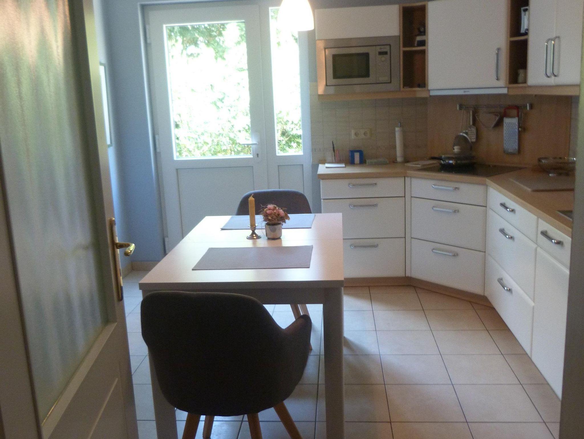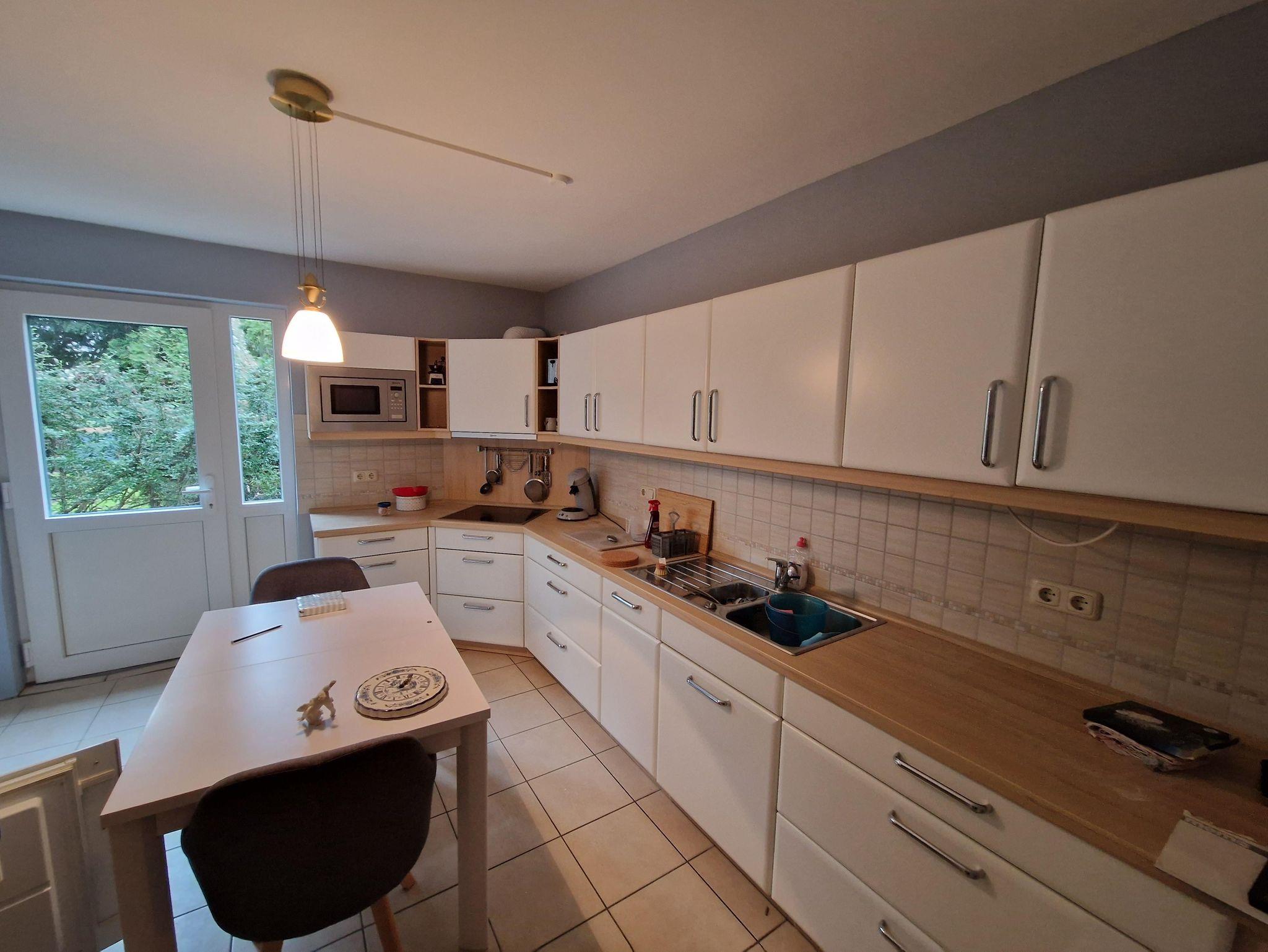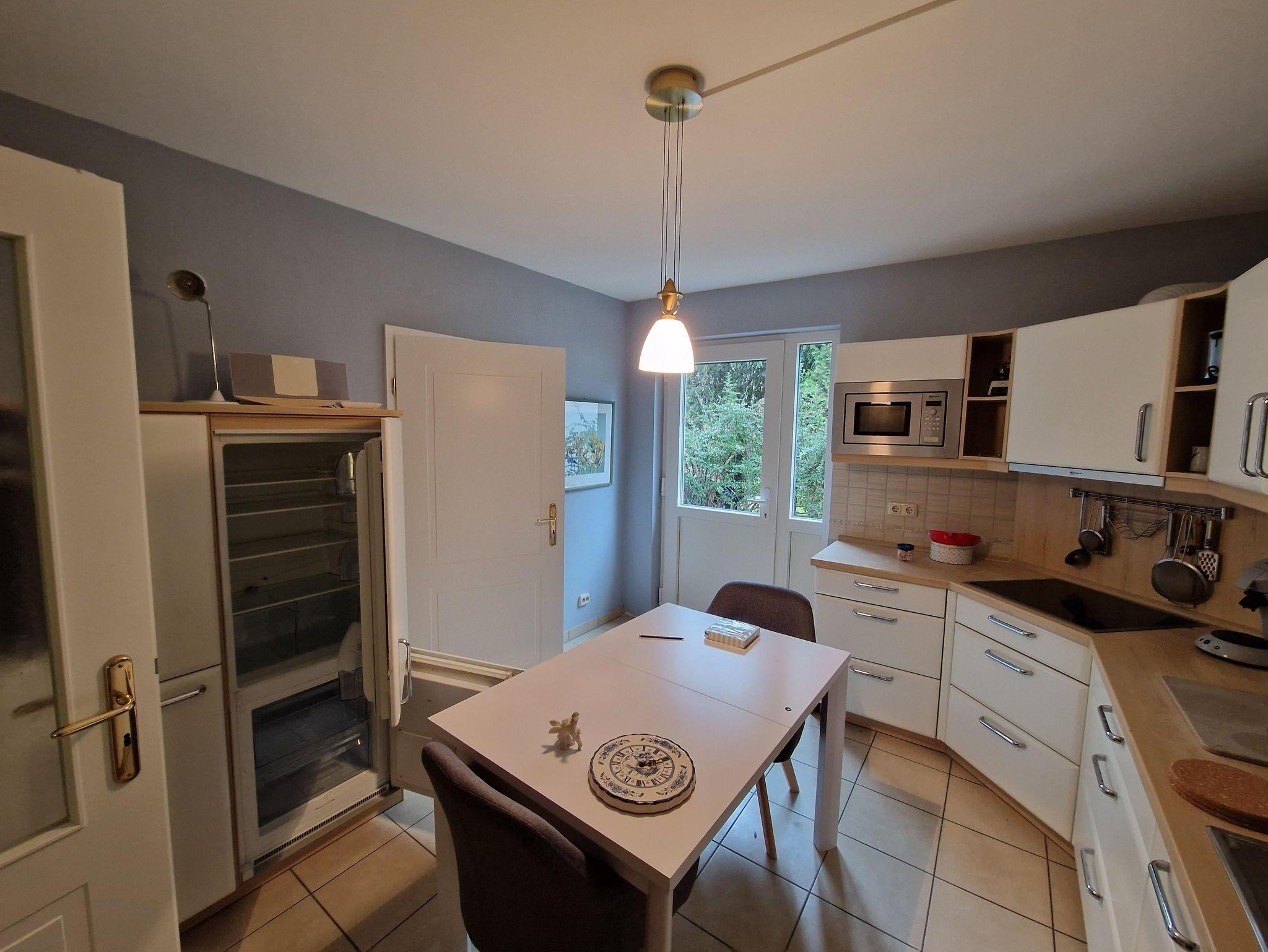 Die Wohnung ist komplett möbliert, die recht komfortable und komplett ausgestattete Wohnküche mit Geschirrspüler und Waschmaschine ausgestattet. Das gesamte Haus - und damit auch die Ferienwohnung - ist mit Fußbodenheizung ausgestattet. Vom Wohn- und Schlafzimmer aus haben Sie einen Blick in unseren Garten und auf die Terrasse. Diese dürfen Sie gerne nach Absprache nutzen. Dafür stehen auch Gartenmöbel zur Verfügung.