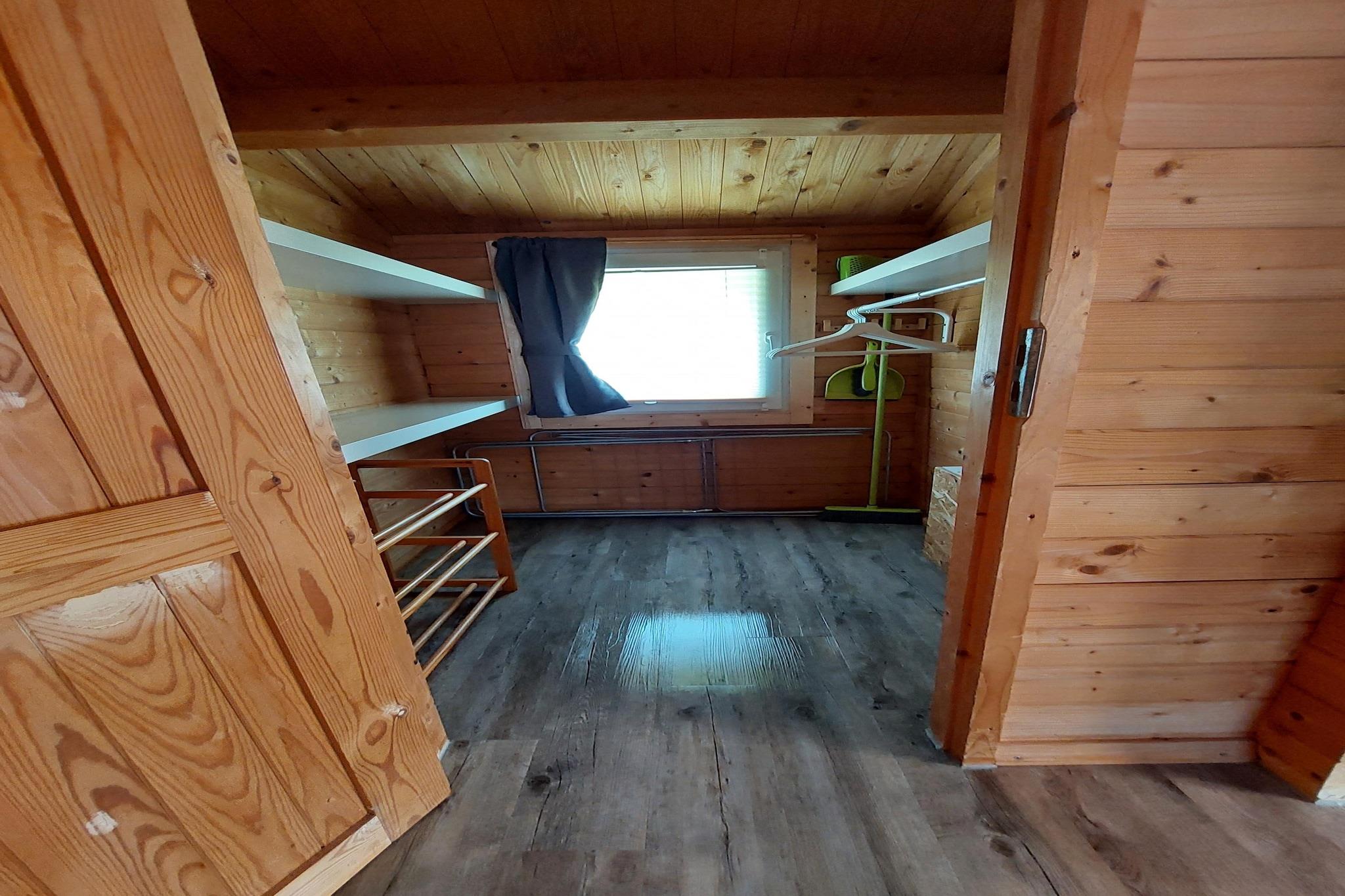 Stueetage: (åbent køkken(elkedel, brødrister, komfur(Komfur med fire kogeplader, glaskeramisk), kaffemaskine, ovn), Stue/soveværelse(dobbeltseng, Fjernsyn(fladskærm), sofahjørne), badeværelse(bruser, håndvask, toilet), åbent rum(via forholdsvis stejle trapper)(dobbeltalkove), pulterkammer) carport, CD-afspiller, grill, terrasse(overdækket), have(privat, indhegnet), havemøbler, parkering, loungemøbler, hyggespil, legetøj