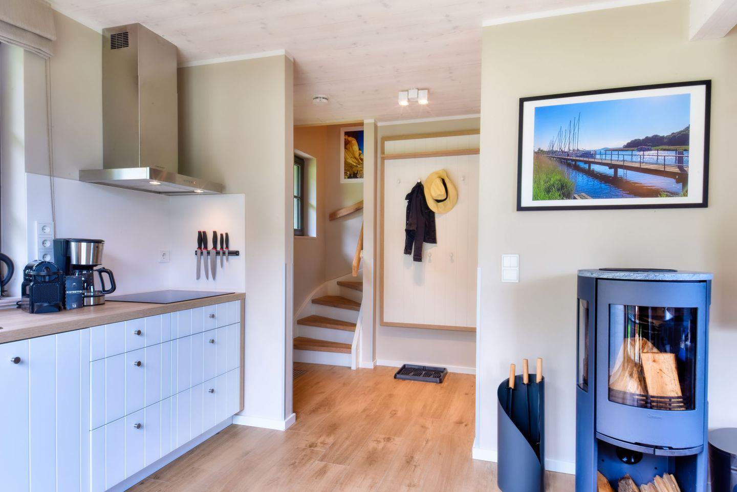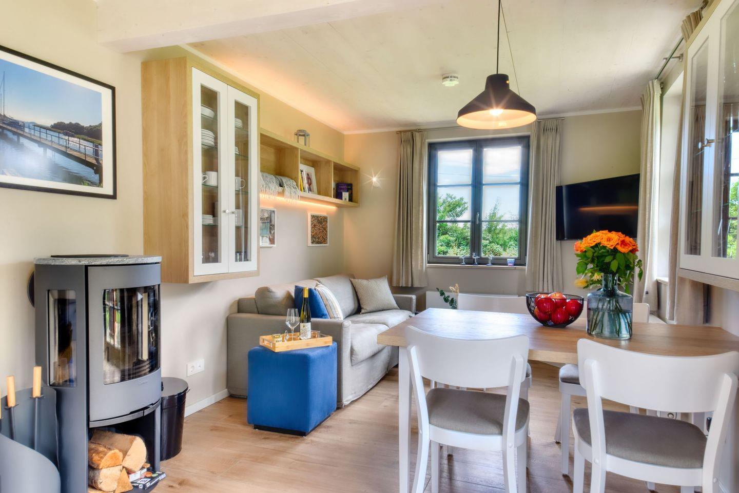 Im Feriendorf Klein Stresow werden Sie auf 61 Quadratmeter in Ihrer eigenen, stylischen Ferienhaushälfte mit Garten und Weitblick begrüßt . Hier beginnt der Urlaub für bis zu 6 Personen schon beim Eintreten. Wenn Sie es genau nehmen, schon beim Ankommen. Das Auto auf dem für Sie reservierten Stellplatz abgestellt, können Sie bei so viel sonniger Leichtigkeit erst einmal richtig durchatmen. Öffnen Sie die bodentiefen Fenster zu Ihrer Westterrasse weit und genießen Sie die frische Ostseebrise. Hier lässt es sich ausgezeichnet frühstücken. Das Innere Ihrer Ferienhaushälfte ist bis ins Detail aufs Feinste eingerichtet. Lampen, Möbel und Bilder sind nordisch nobel. Ein Sofa lädt zum Relaxen ein. Zur Ausstattung des Wohn-Esszimmers gehören ein Kamin und ein Flat-TV. Das WLAN können Sie kostenfrei nutzen. Ein schöner Esstisch mit vier Stühlen eignet sich bestens für die Mahlzeiten.