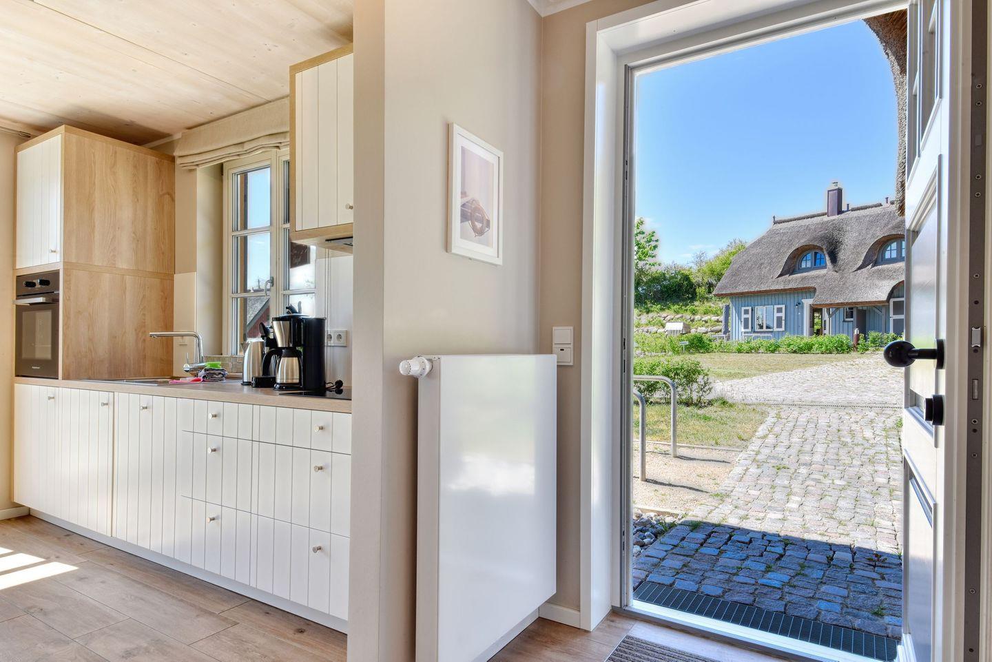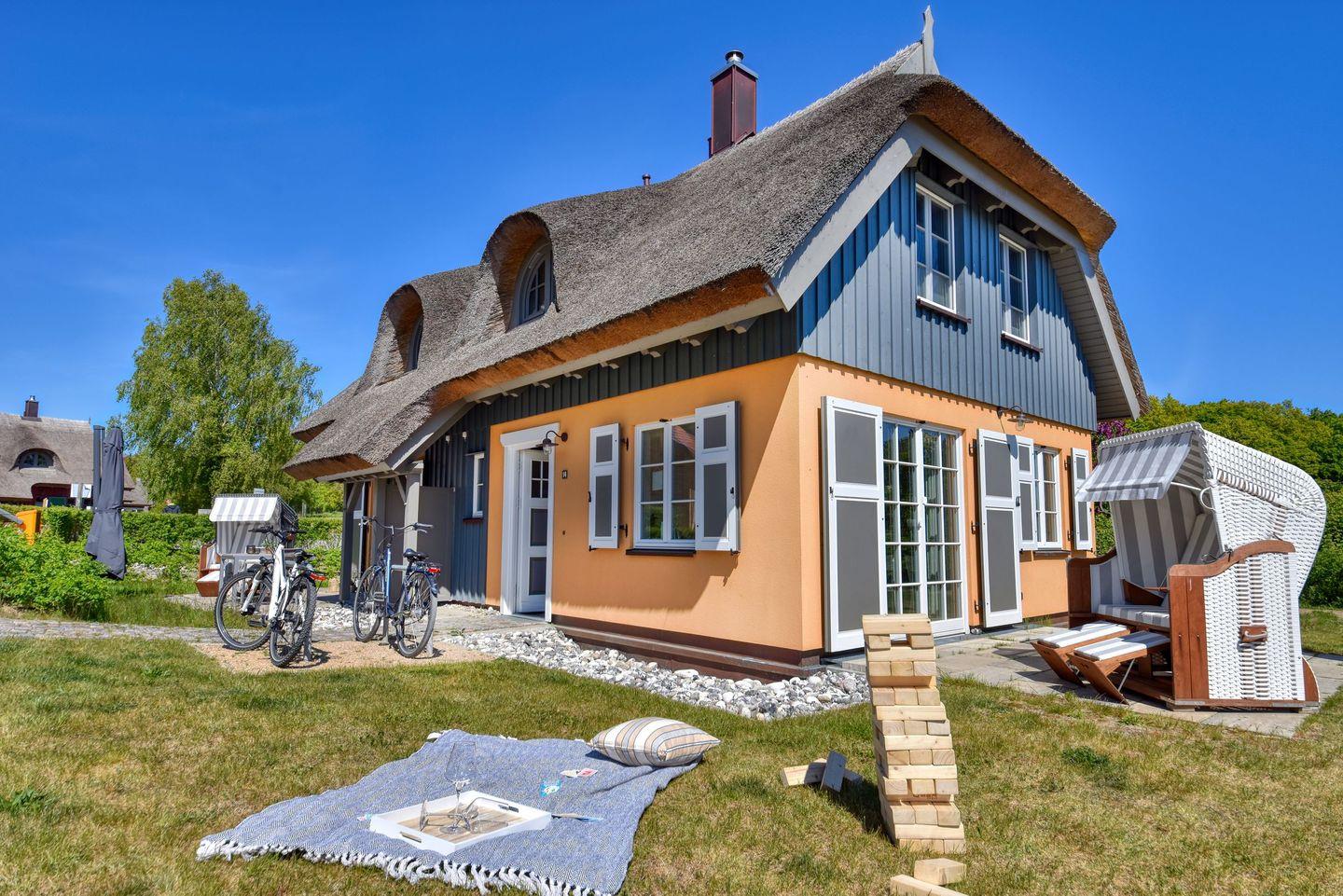 Im Feriendorf Klein Stresow werden Sie in Ihrer eigenen, stylischen Reethaushälfte mit Garten und Weitblick begrüßt . Hier beginnt der Urlaub für bis zu 4 Personen schon beim Eintreten. Wenn Sie es genau nehmen, schon beim Ankommen. Das Auto auf dem für Sie reservierten Stellplatz abgestellt, können Sie bei so viel sonniger Leichtigkeit erst einmal richtig durchatmen. Öffnen Sie die bodentiefen Fenster zu Ihrer Südterrasse weit und genießen Sie die frische Ostseebrise. Hier lässt es sich ausgezeichnet frühstücken. Das Innere Ihrer Ferienhaushälfte ist bis ins Detail aufs Feinste eingerichtet. Lampen, Möbel und Bilder sind nordisch nobel. Ein Sofa lädt zum Relaxen ein. Zur Ausstattung des Wohn-Esszimmers gehören ein Kamin und ein Flat-TV. Das WLAN können Sie kostenfrei nutzen. Ein schöner Esstisch mit vier Stühlen eignet sich bestens für die Mahlzeiten.