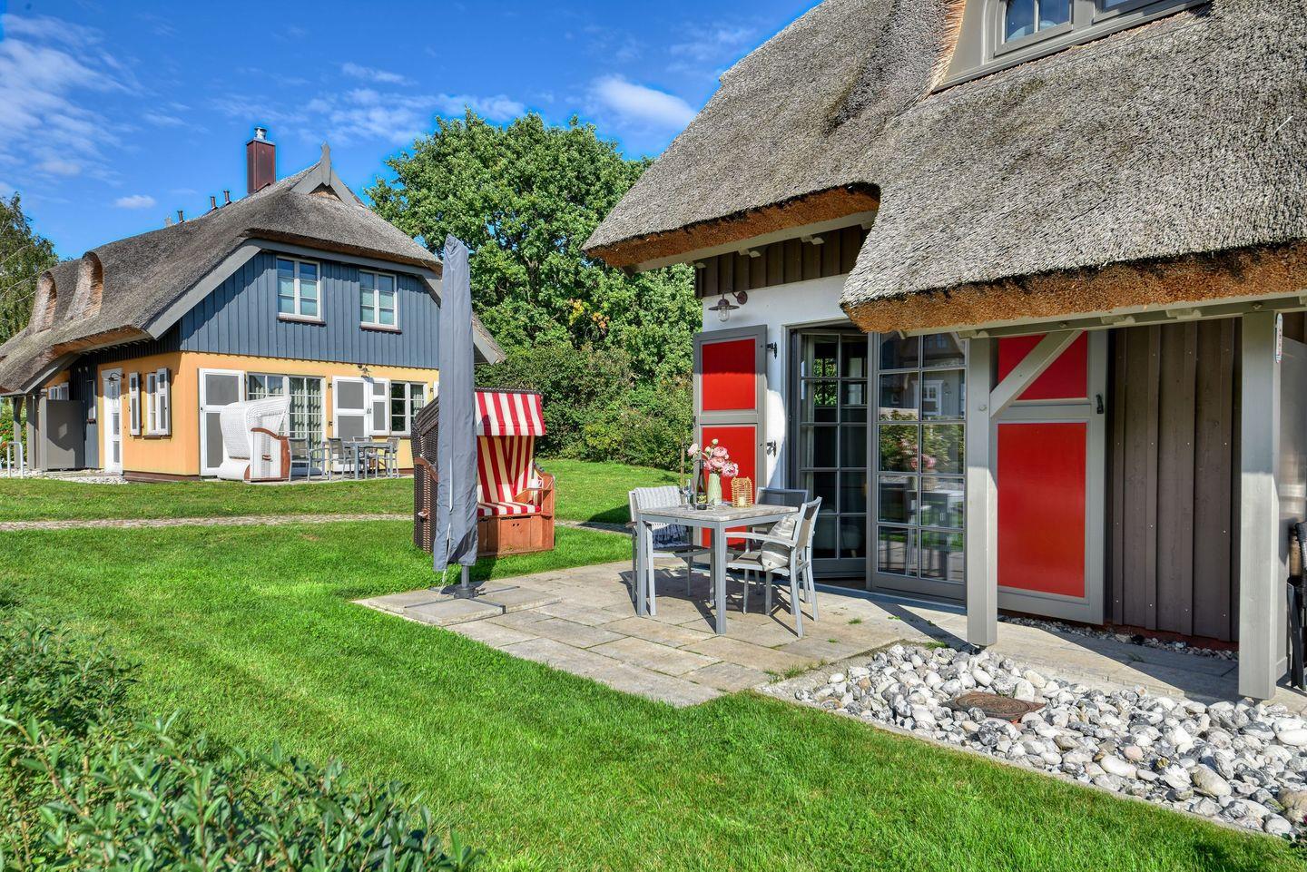 Im Feriendorf Klein Stresow werden Sie auf 43 Quadratmeter in Ihrer eigenen, stylischen Ferienhaushälfte mit Garten und Weitblick begrüßt . Hier beginnt der Urlaub für bis zu 4 Personen schon beim Eintreten. Wenn Sie es genau nehmen, schon beim Ankommen. Das Auto auf dem für Sie reservierten Stellplatz abgestellt, können Sie bei so viel sonniger Leichtigkeit erst einmal richtig durchatmen. Öffnen Sie die bodentiefen Fenster zu Ihrer Westterrasse und genießen Sie die frische Ostseebrise. Hier lässt es sich ausgezeichnet frühstücken. Das Innere Ihrer Ferienhaushälfte ist bis ins Detail aufs Feinste eingerichtet. Lampen, Möbel und Bilder sind nordisch nobel. Ein Sofa lädt zum Relaxen ein. Zur Ausstattung des Wohn-Esszimmers gehört ein Flat-TV. Das WLAN können Sie kostenfrei nutzen. Ein schöner Esstisch mit vier Stühlen eignet sich bestens für die Mahlzeiten.