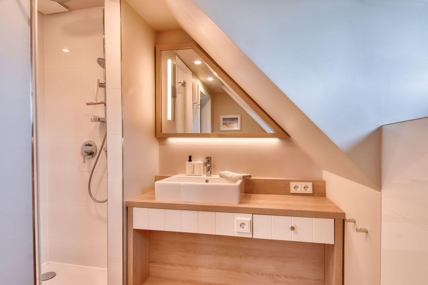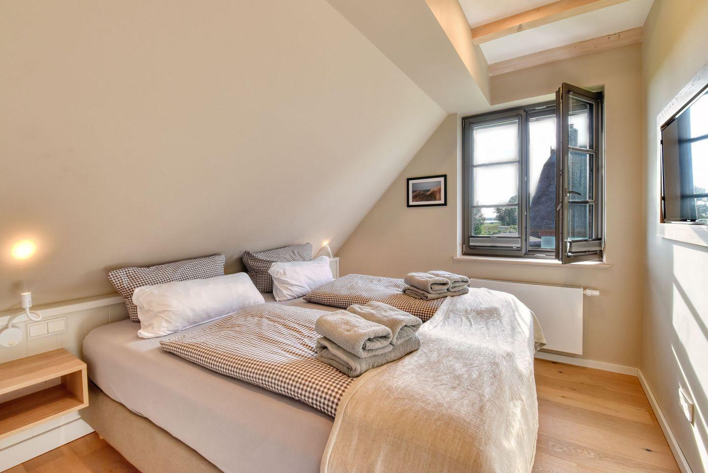 Zubereiten können Sie Ihre Mahlzeiten in der offenen und modernen Küche, welche voll ausgestattet ist und über einen elektrischen Tischgrill verfügt. Dieser ist auch für die Nutzung auf der Terrasse geeignet. Alle Geräte sind hochwertig. Ein komplettes Geschirr-Service befindet sich in den Schränken. Abwaschen muss hier zum Glück niemand, es gibt einen Geschirrspüler. Weiter geht es mit den beiden komfortablen Schlafzimmern. Ein bequemes Boxspringdoppelbett (180 x 200) und zwei Boxspringeinzelbetten (90 x 200) versprechen erholsame Träume. Die Zimmer verfügen über je einen Kleiderschrank und ebenfalls einen Flat-TV. Zwei Bäder mit Dusche und WC sorgen für genügend Raum zum Frischmachen. Das Bad im EG ist zudem mit einer Finnischen Sauna ausgestattet. Bei Anreise liegen Handtücher für Sie bereit und die Betten sind bezogen.