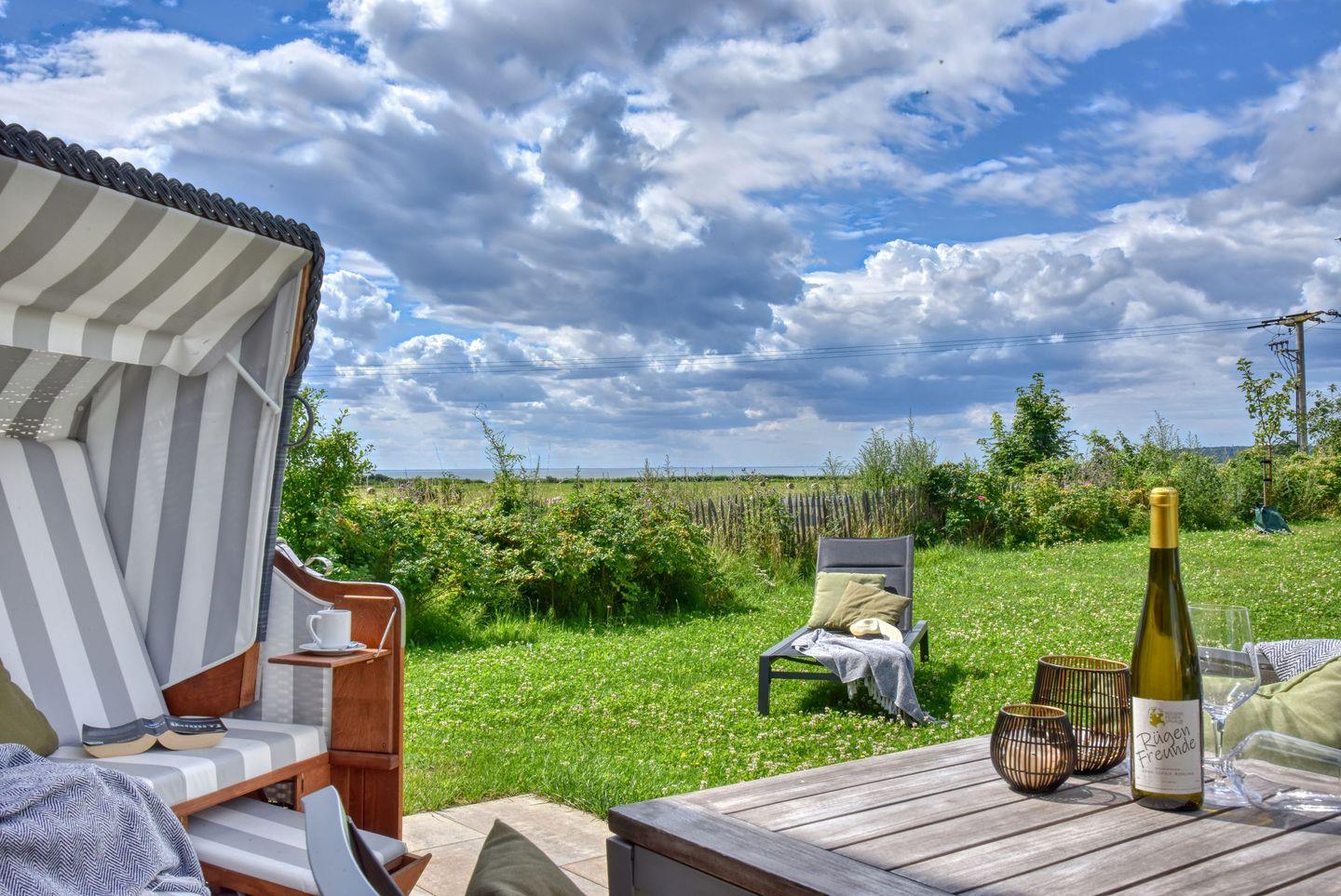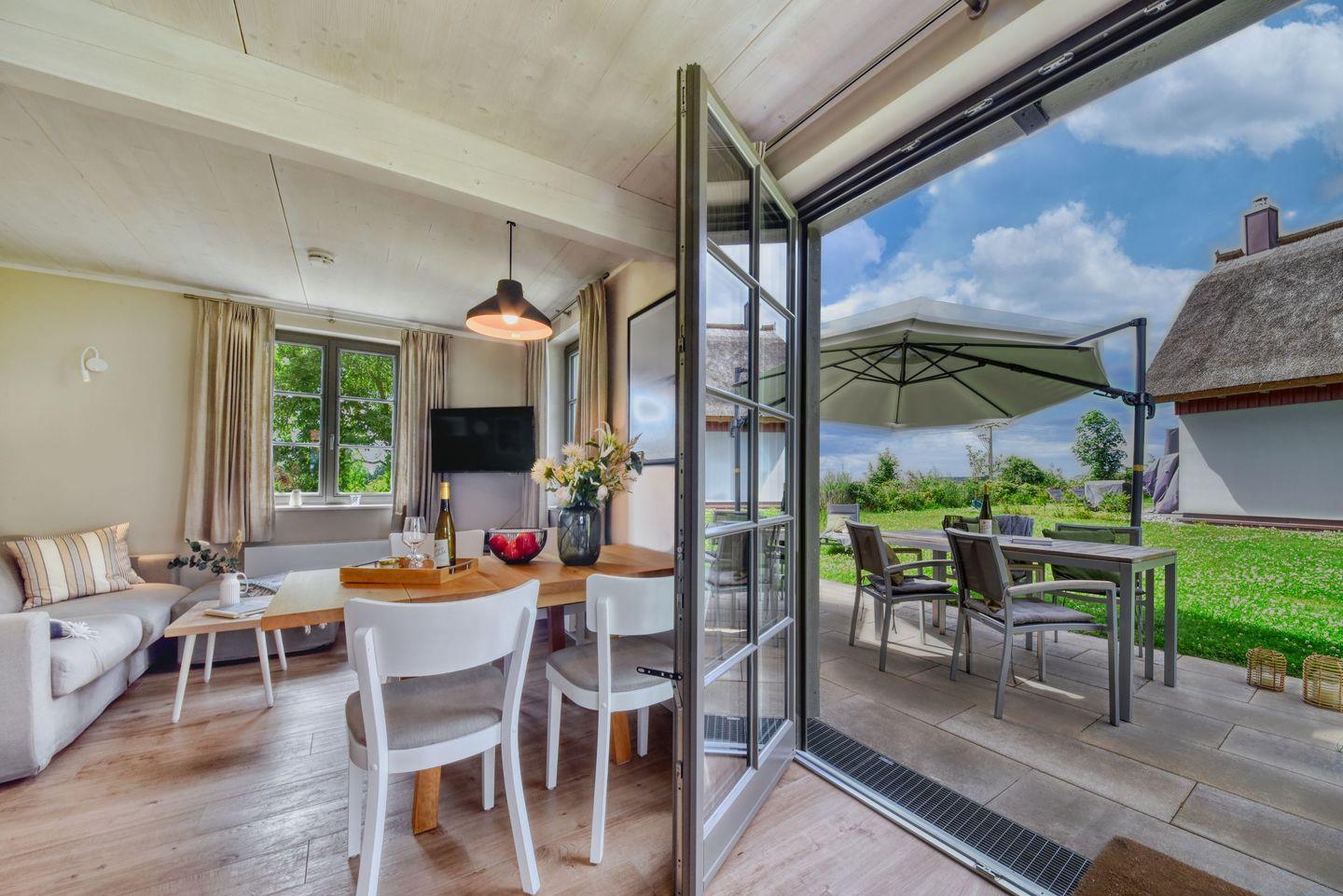 Im Feriendorf Klein Stresow werden Sie im „Seeblick-Ferienhaus Huus Waterkant“ auf 61 Quadratmetern in Ihrer eigenen, im skandi-chic eingerichteten Ferienhaushälfte begrüßt. Aus dem Wohn-/ Essbereich kommen sie stufenlos in den Garten und können den unverbauten Meerblick genießen. Hier beginnt der Urlaub für bis zu 4 Personen schon beim Eintreten. Wenn Sie es genau nehmen, schon beim Ankommen. Das Auto auf dem für Sie reservierten Stellplatz abgestellt, können Sie bei so viel sonniger Leichtigkeit erst einmal richtig durchatmen. Öffnen Sie die bodentiefen Fenster zu Ihrer Südterrasse weit und genießen Sie die frische Ostseebrise. Hier lässt es sich ausgezeichnet frühstücken. Das Innere Ihrer Ferienhaushälfte ist bis ins Detail geschmackvoll eingerichtet. Lampen, Möbel und Bilder sind harmonisch aufeinander abgestimmt. Ein Sofa mit Ottomane lädt zum Relaxen ein. Zur Ausstattung des Wohn-Esszimmers gehören ein Kamin und ein Flat-TV. Das WLAN können Sie kostenfrei nutzen. Ein schöner Esstisch mit vier Stühlen eignet sich bestens für gesellige Stunden bei gutem Essen.