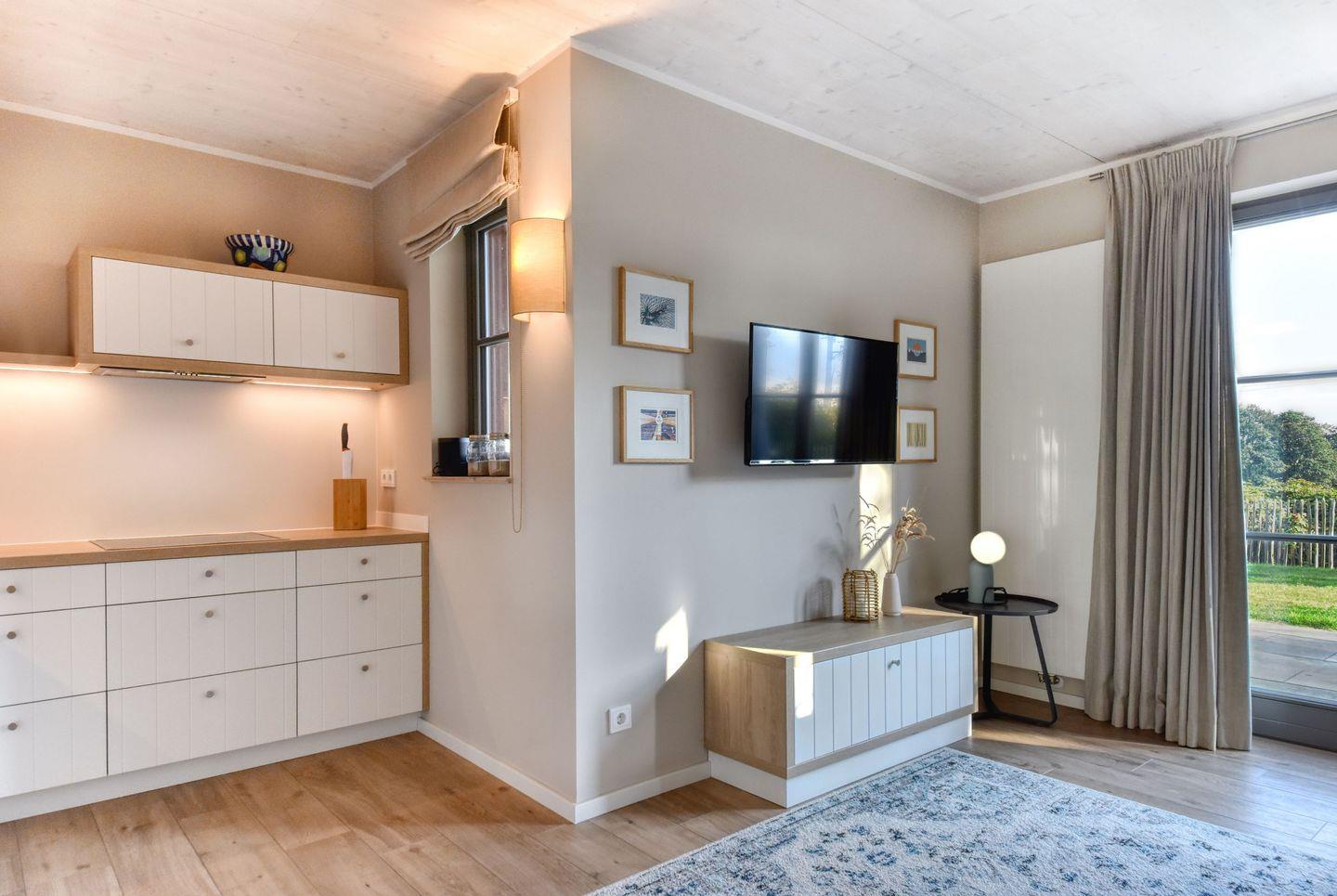 Im Feriendorf Klein Stresow werden Sie im „Seeblick-Ferienhaus Küstenhuus“ auf 115 Quadratmetern in Ihrer eigenen, stylischen Ferienhaushälfte mit Garten und direktem, unverbautem Meerblick von jedem Zimmer aus begrüßt. Hier beginnt der Urlaub für bis zu 6 Personen schon beim Eintreten. Wenn Sie es genau nehmen, schon beim Ankommen. Das Auto auf dem für Sie reservierten Stellplatz abgestellt, können Sie bei so viel sonniger Leichtigkeit erst einmal richtig durchatmen. Öffnen Sie die bodentiefen Fenster zu Ihrer Südterrasse weit und genießen Sie die frische Ostseebrise. Hier lässt es sich ausgezeichnet frühstücken. Das Innere Ihrer Ferienhaushälfte ist bis ins Detail aufs Feinste eingerichtet. Lampen, Möbel und Bilder sind nordisch nobel. Ein Sofa lädt zum Relaxen ein. Zur Ausstattung des Wohn-Esszimmers gehören ein Kamin und ein Flat-TV. Das WLAN können Sie kostenfrei nutzen. Ein schöner Esstisch mit sechs Stühlen eignet sich bestens für die Mahlzeiten.