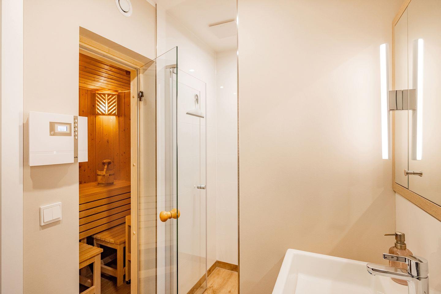 Zubereiten können Sie sie in der offenen und modernen Küche. Alle Geräte sind hochwertig. Ein komplettes Geschirr-Service befindet sich in den Schränken. Abwaschen muss hier zum Glück niemand. Es gibt einen Geschirrspüler. Weiter geht’s mit einem komfortablen Wohlfühlschafzimmer von 11m² mit einer Raumhöhe von über 3 Meter. Ein bequemes Boxspringdoppelbett (180 x 200) verspricht erholsame Träume. Die Zimmer verfügen über je einen Kleiderschrank und ebenfalls einen Flat-TV. Ein Bad mit Dusche und WC sorgen für genügend Raum zum Frischmachen. Das Bad ist zudem mit einer Finnischen Sauna ausgestattet. Bei Anreise liegen Handtücher für Sie bereit und die Betten sind bezogen.