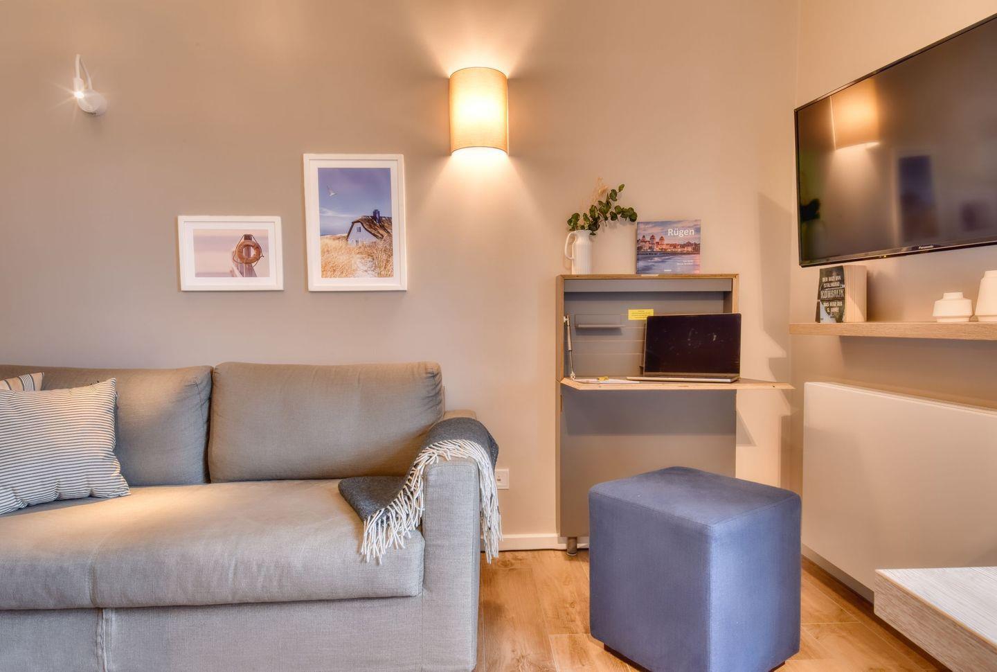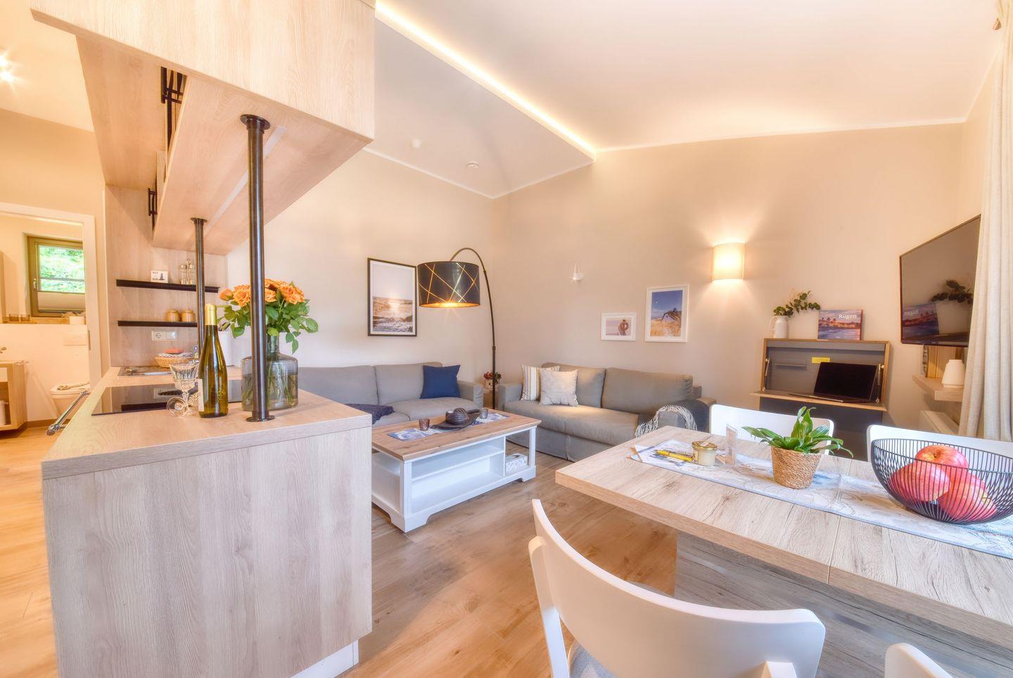 Im Feriendorf Klein Stresow werden Sie auf 53 Quadratmeter in Ihrer eigenen, stylischen Ferienhaushälfte mit Gründach und Weitblick begrüßt . Hier beginnt der Urlaub für 2 Personen schon beim Eintreten. Wenn Sie es genau nehmen, schon beim Ankommen. Das Auto auf dem für Sie reservierten Stellplatz abgestellt, können Sie bei so viel sonniger Leichtigkeit erst einmal richtig durchatmen. Verweilen Sie auf der 7m² großen Sonnenterrasse mit Meerblick und genießen die frische Ostseebrise. Hier lässt es sich ausgezeichnet frühstücken. Das Innere Ihrer Ferienhaushälfte ist bis ins Detail aufs Feinste eingerichtet. Lampen, Möbel und Bilder sind nordisch nobel. Zwei Sofas laden zum Relaxen ein, ein großer lichtdurchfluteter Wohnraum von 28m² mit über 3 Meter Deckenhöhe. Zur Ausstattung des Wohn-Esszimmers gehört ein Flat-TV. Das WLAN können Sie kostenfrei nutzen. Ein schöner Esstisch mit vier Stühlen eignet sich bestens für die Mahlzeiten.