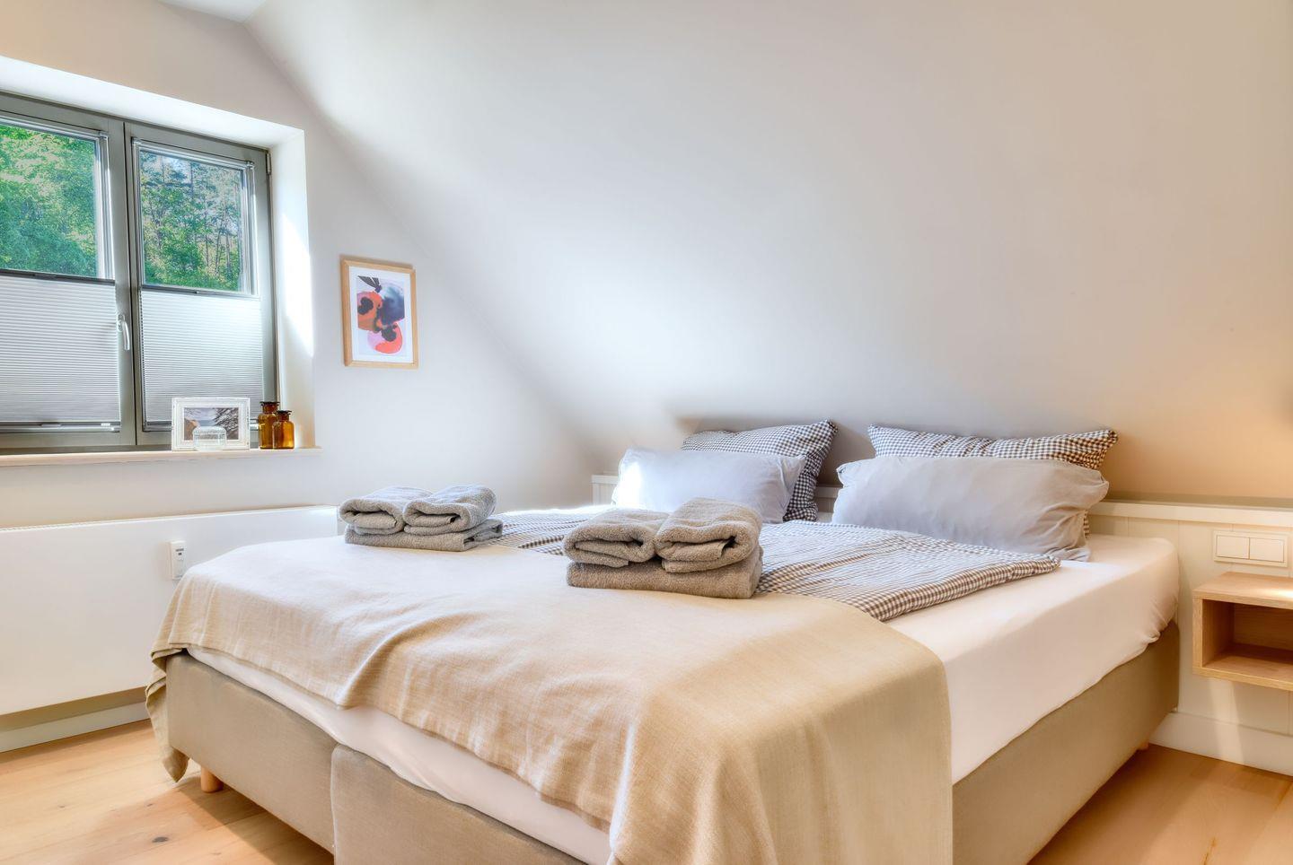 Zubereiten können Sie sie in der offenen und modernen Küche. Alle Geräte sind hochwertig. Ein komplettes Geschirr-Service befindet sich in den Schränken. Abwaschen muss hier zum Glück niemand. Es gibt einen Geschirrspüler. Weiter geht’s mit den beiden komfortablen Schlafzimmern. Ein bequemes Boxspringdoppelbett (180 x 210) und zwei Boxspringeinzelbetten (90 x 200) versprechen erholsame Träume. Die Zimmer verfügen über je einen Kleiderschrank und ebenfalls einen Flat-TV. Ein Bad mit Dusche und WC sorgen für genügend Raum zum Frischmachen. Das Bad ist zudem mit einer Finnischen Sauna ausgestattet. Bei Anreise liegen Handtücher für Sie bereit und die Betten sind bezogen.
