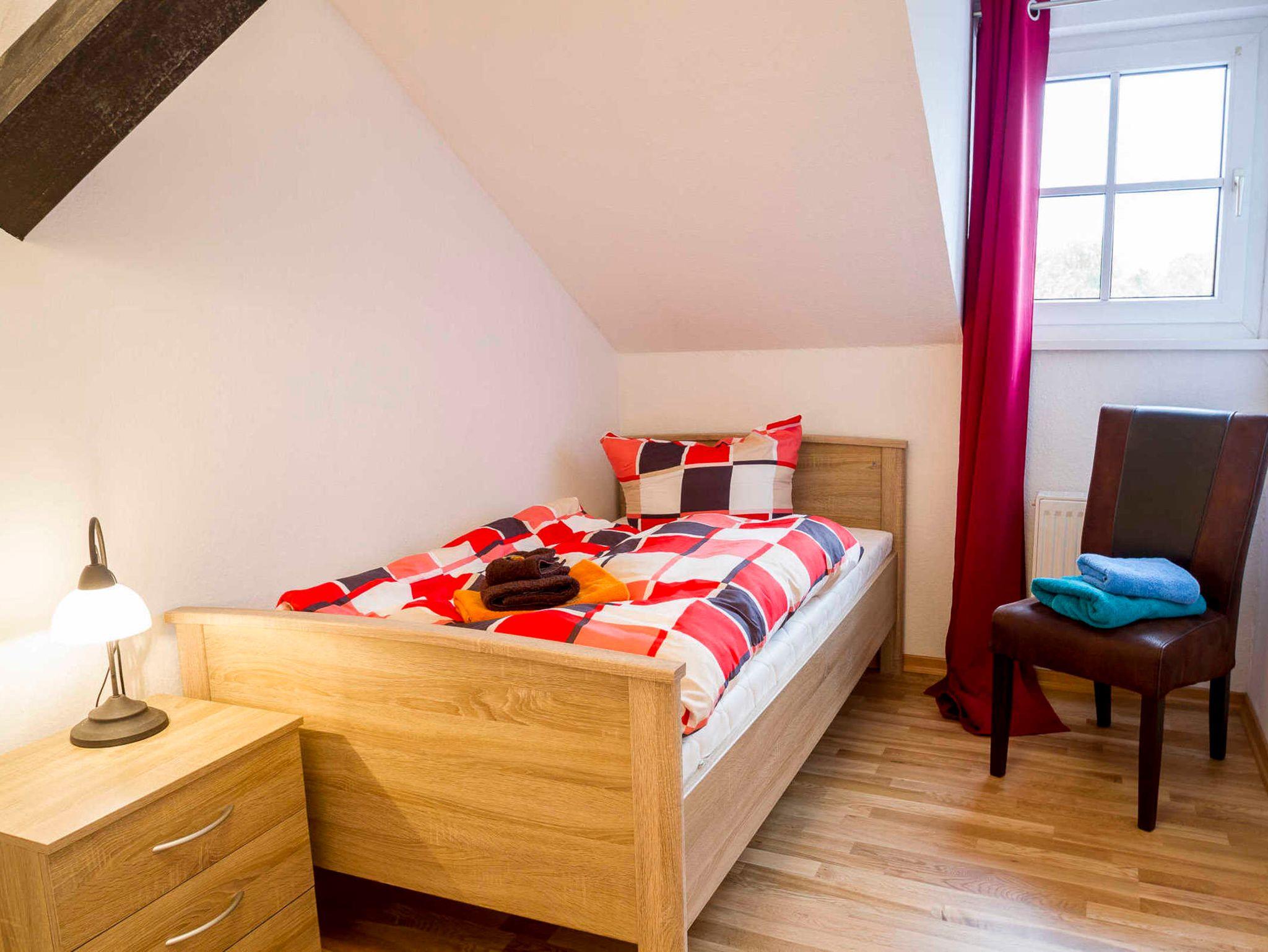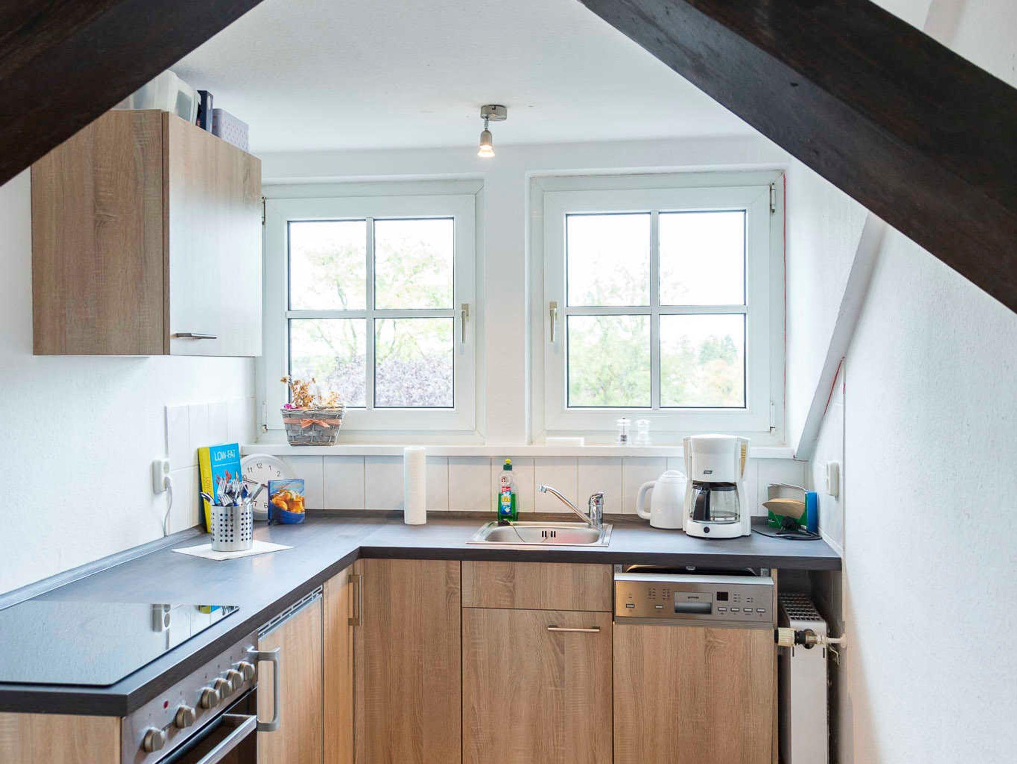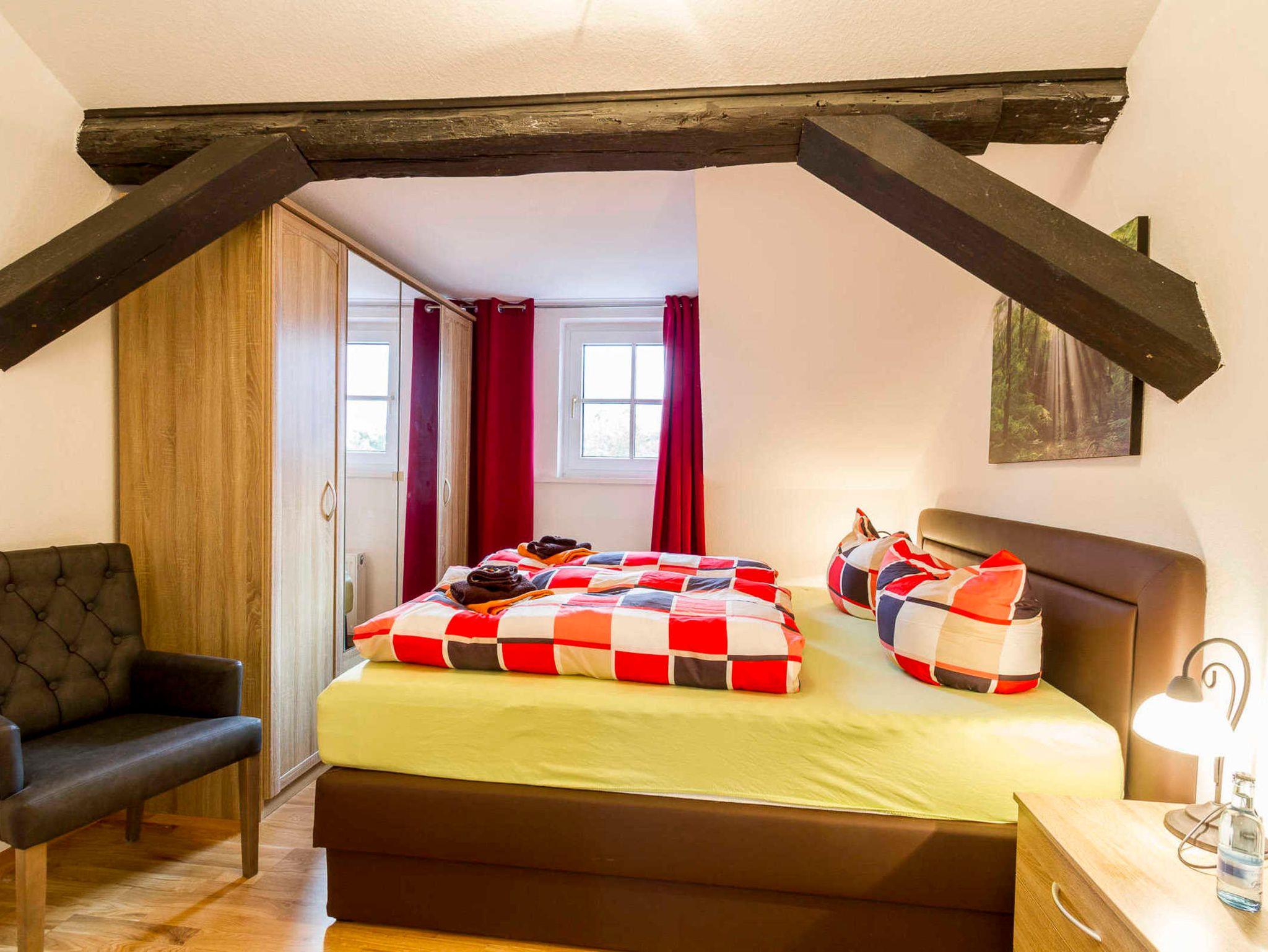 Ferienwohnung Hofblick: 120 m², 3 Schlafzimmer, für bis 6 Personen, alle mit Fernseher ausgestattet, ein schönes Bad, eine großzügige Wohnküche mit integriertem Wohnzimmer.