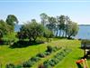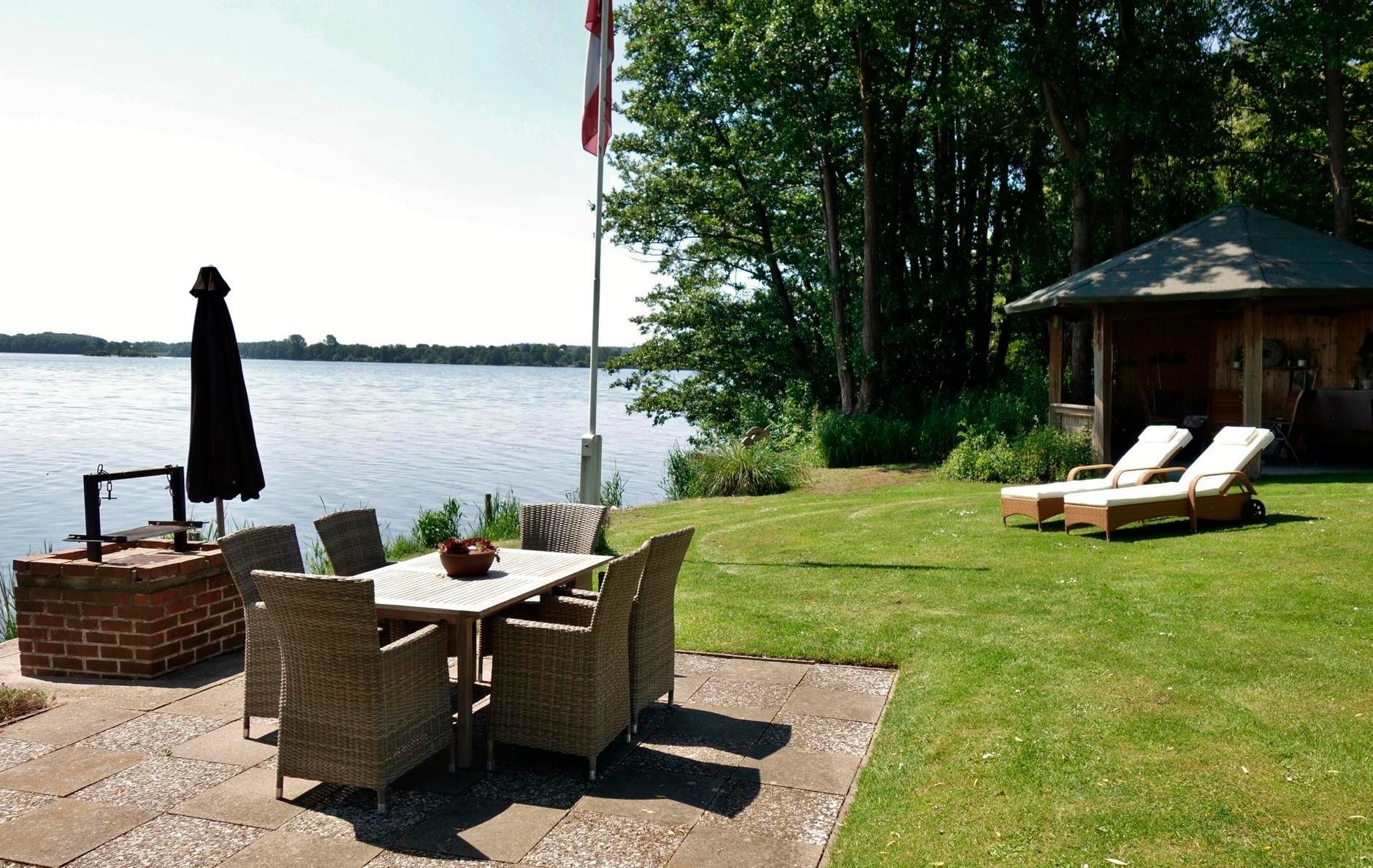 Der große Wohngarten, mit vielen Sitzgruppen, lädt zum Verweilen ein und bietet einen unvergleichlich freien Blick über den See.