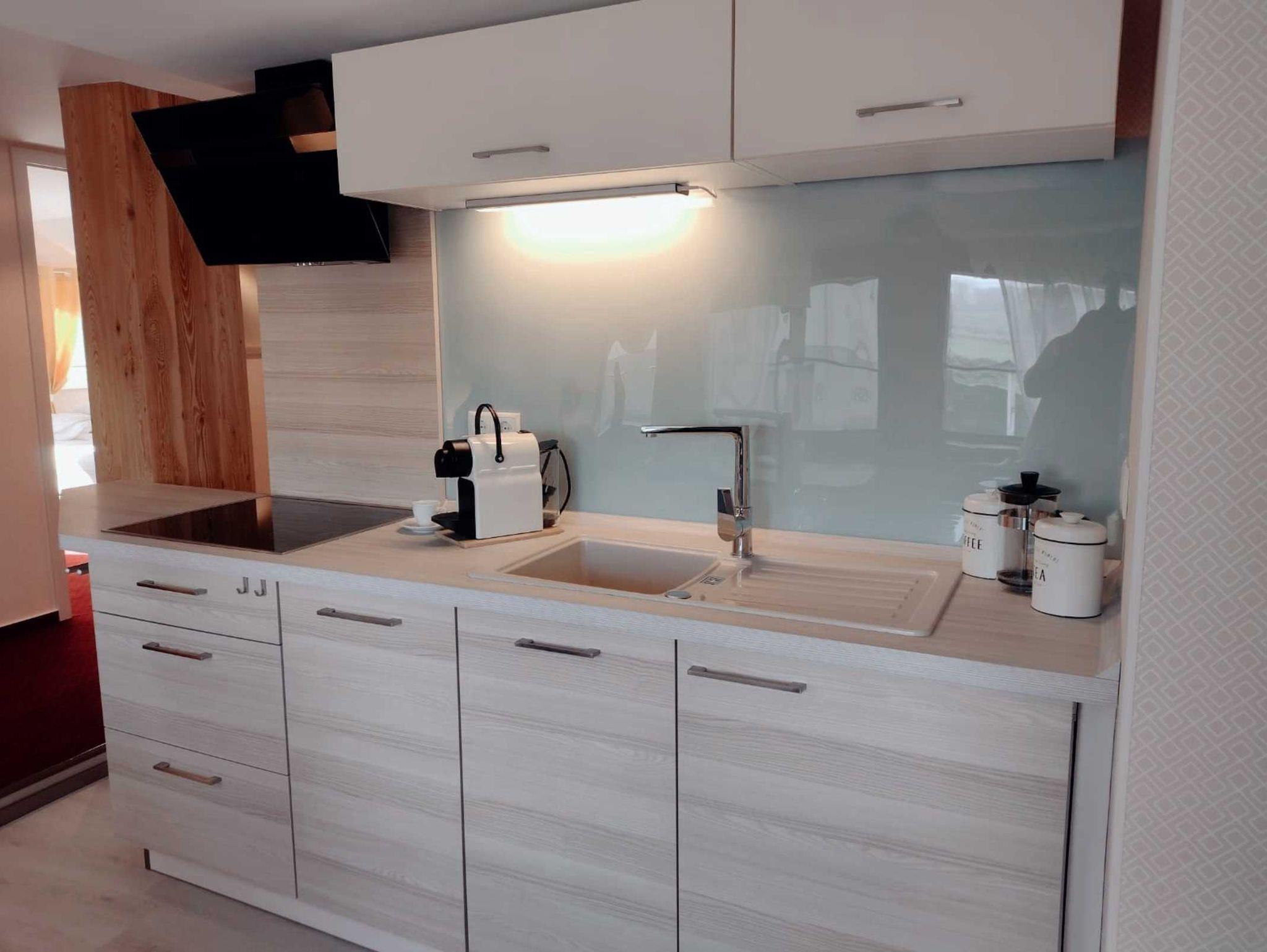 Unsere 2 Raum-WestStube (Himmelsrichtung, 45 qm) befindet sich im Dachgeschoss, ideal für den nächsten Familienurlaub. Platz für 3 Personen, getrennter Wohn-und Schlafbereich in hellen und gemütlichen Farben, Einbauküche mit Geschirrspüler und ein kleines Bad mit DU/WC.