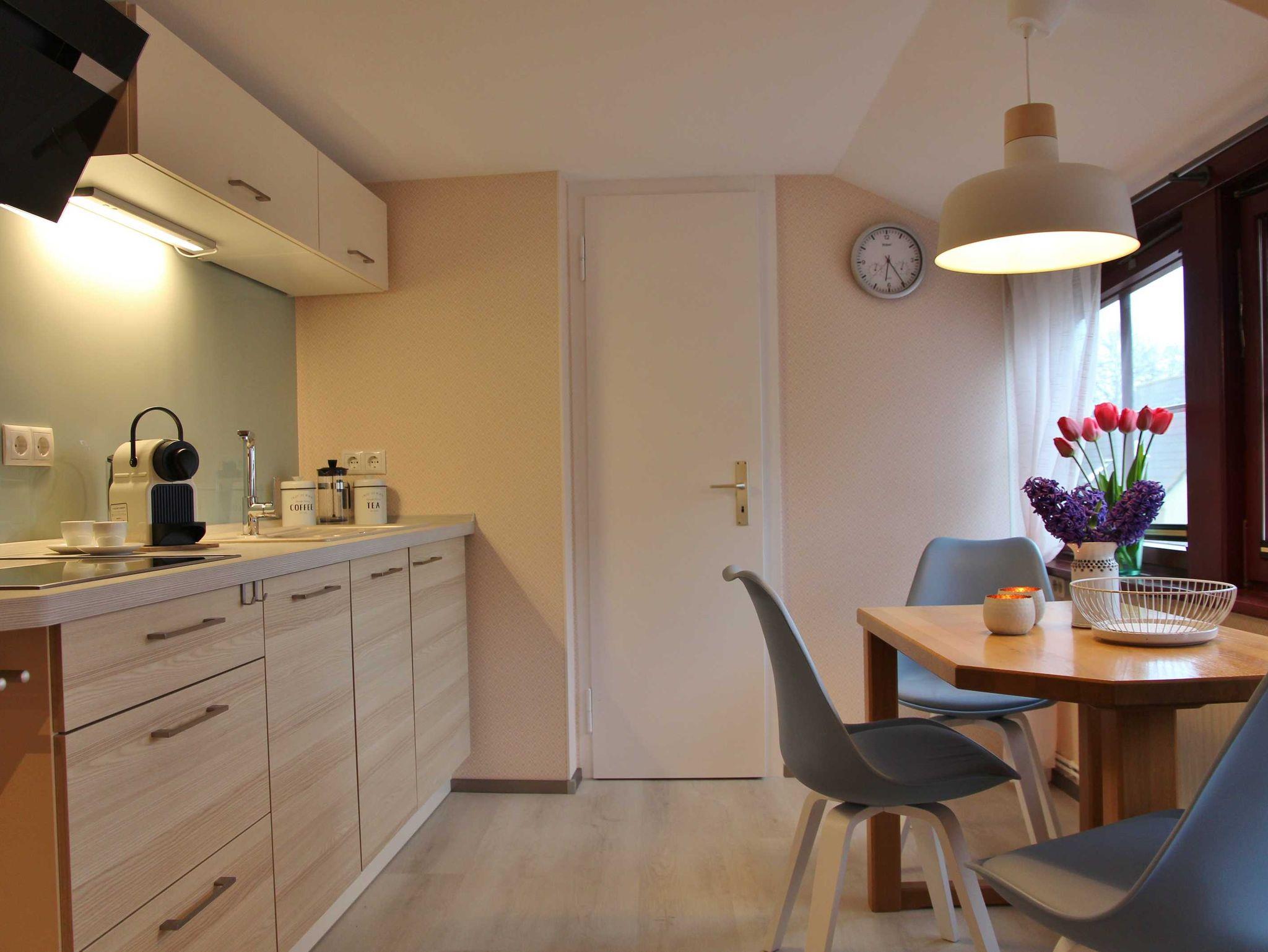 Der Essbereich befindet sich direkt an der großen Dach-Gaupe, mit Blick auf das bunte Treiben vor dem Haus. Reisebettchen im Schlafzimmer vorhanden, alternativ Aufbettung im Wohnbereich möglich. Die Terrasse befindet sich im Garten.
