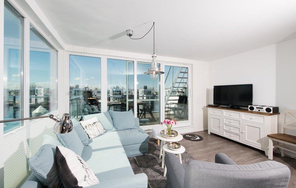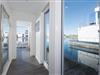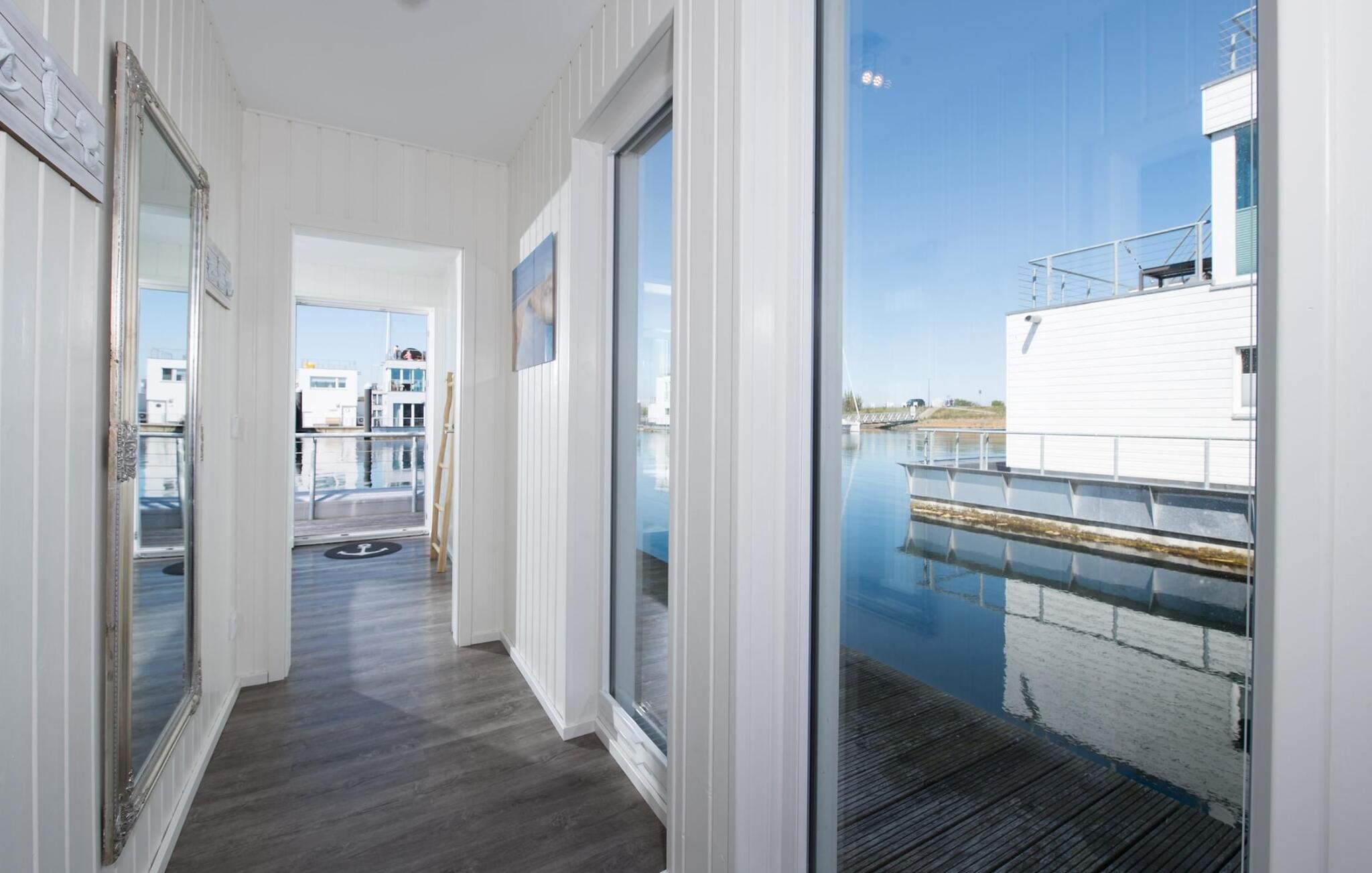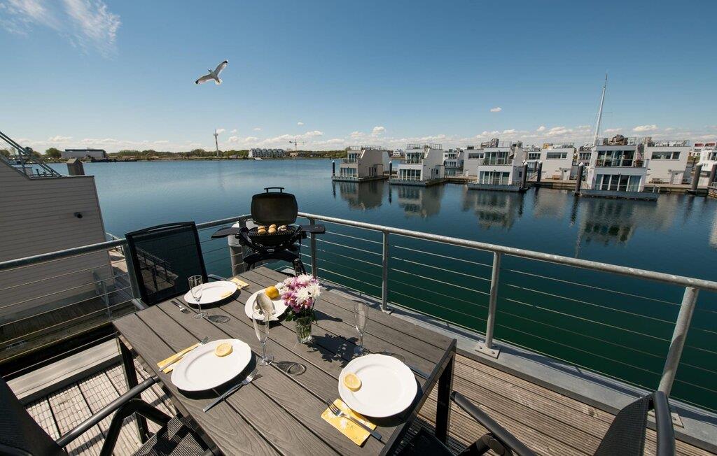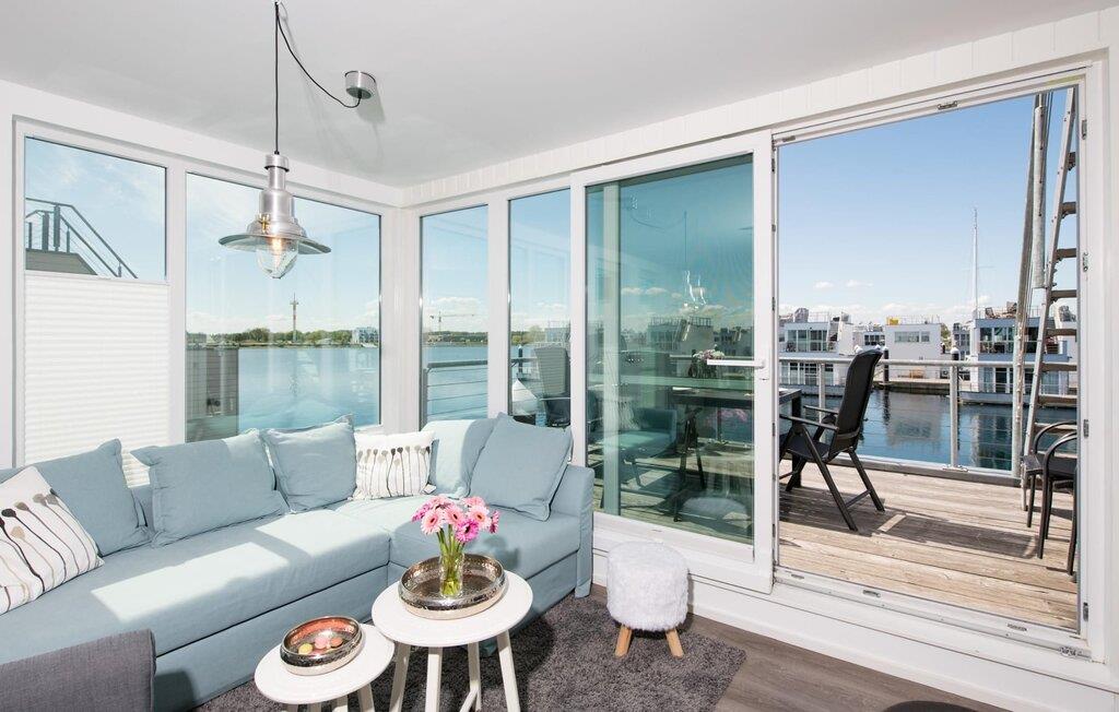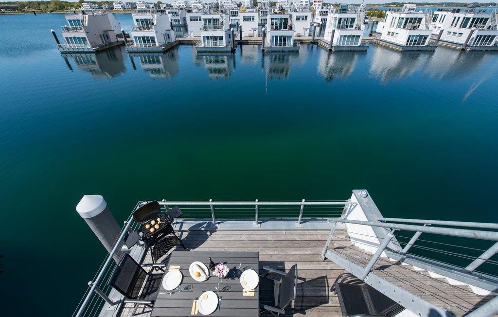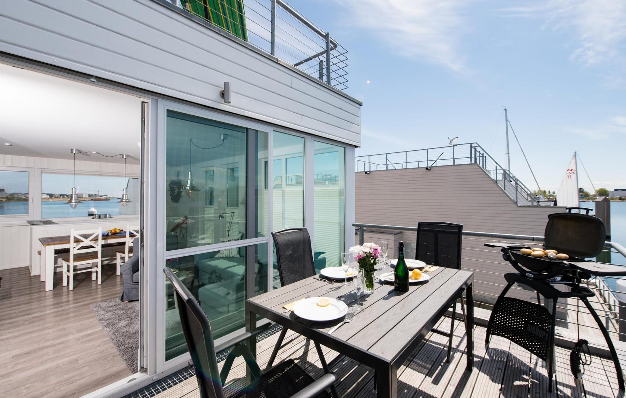 Dette flydende hus er fordelt på tre etager og kan rumme seks personer. På øverste etage er der opholds- og spisestue i åbent plan med udsigt til vandet hele vejen rundt, fuldt udstyret køkken-alrum og tilstødende terrasse. Herfra kan I få adgang til den spektakulære tagterrasse med udsigt over sejl- og sportsbådshavnen, Sleien og dens udmunding i Østersøen. Udstyret med havemøbler af høj kvalitet og en Weber el-grill tilbyder terrasserne en ren feriefølelse og betagende solnedgange.