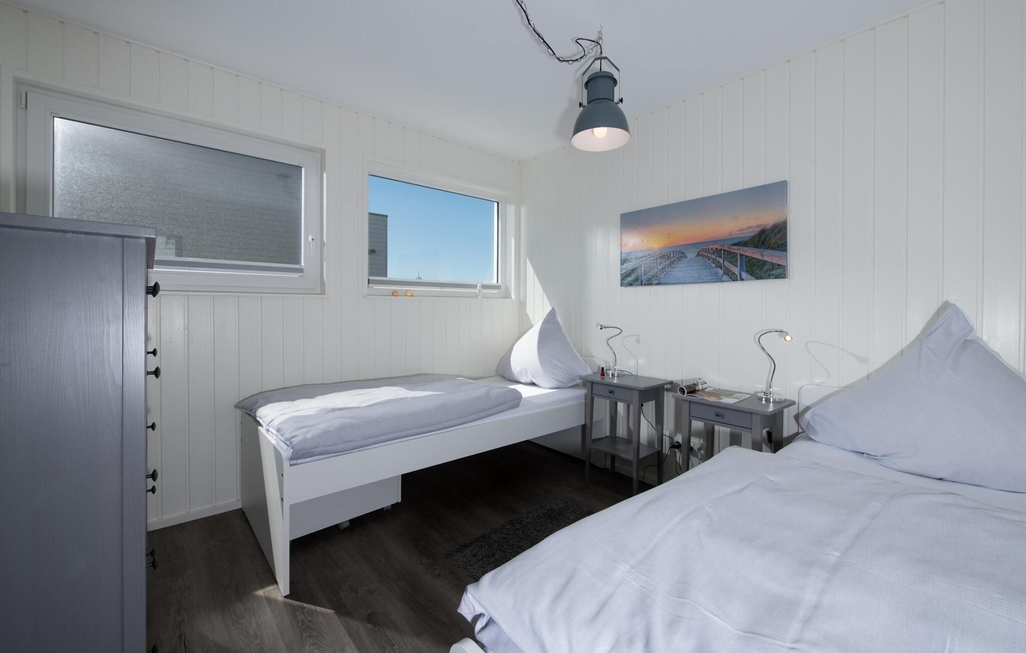 Husets afslapningsområde er i stueetagen med to soveværelser, badeværelse og sauna. Det store soveværelse imponerer med et panoramavindue fra gulv til loft, hvorigennem I kan nyde den betagende vandkulisse. Det store soveværelse er udstyret med en dobbeltseng (180 x 200 cm), det andet soveværelse med to enkeltsenge. Der er to ekstra sovepladser på den komfortable sovesofa i opholdsområdet.