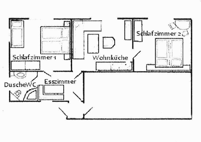 Unsere Ferienwohnung befindet sich im Erdgeschoss unseres Eigenheimes, hat einen separaten Eingang und besteht aus Flur, Dusche mit WC, Wohnzimmer mit Küche, sowie zwei Schlafzimmern.