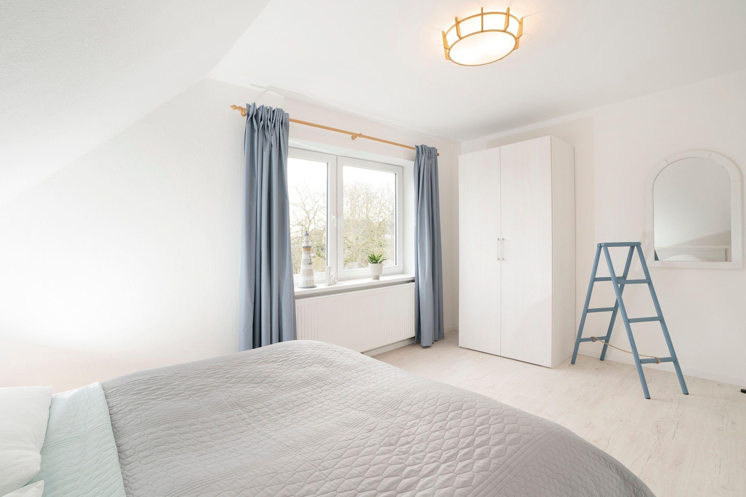 Schlafzimmer 1: 2 Einzelbetten (100x200 cm), Kleiderschrank, Verdunkelung (Vorhang), Platz für Kinderreisebett vorhanden