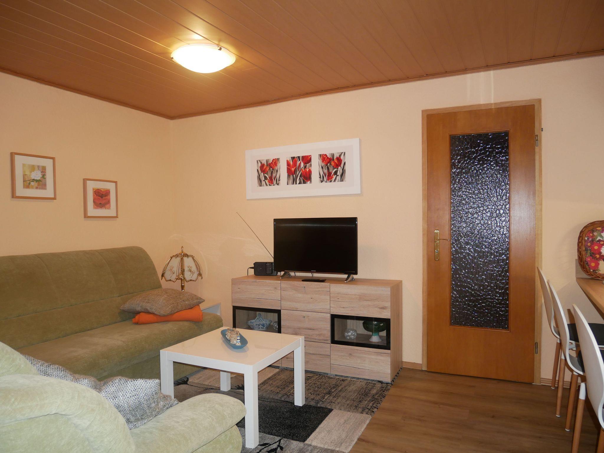 Die Ferienwohnung 1 ist ca. 40m² groß und verfügt über ein Wohnzimmer mit einem Sofa, Flat-TV und Radio. Die offene Küche ist ausgestattet mit einem Mini-Backofen, 2-Platten-Herd, Kühlschrank mit Gefrierfach, Kaffeemaschine, Toaster und Wasserkocher. Das große Schlafzimmer verfügt über ein Doppelbett und über einen Kleiderschrank. Im kleineren Schlafzimmer befindet sich ein Einzelbett. Das Badezimmer ist mit einer ebenerdigen Dusche ausgestattet. Vor der Wohnung befindet sich eine möblierte Terrasse. Zusätzlich finden Sie auf dem Grundstück eine überdachte Laube, die zum Grillen oder gemütlichen Beisammensein geeignet ist.