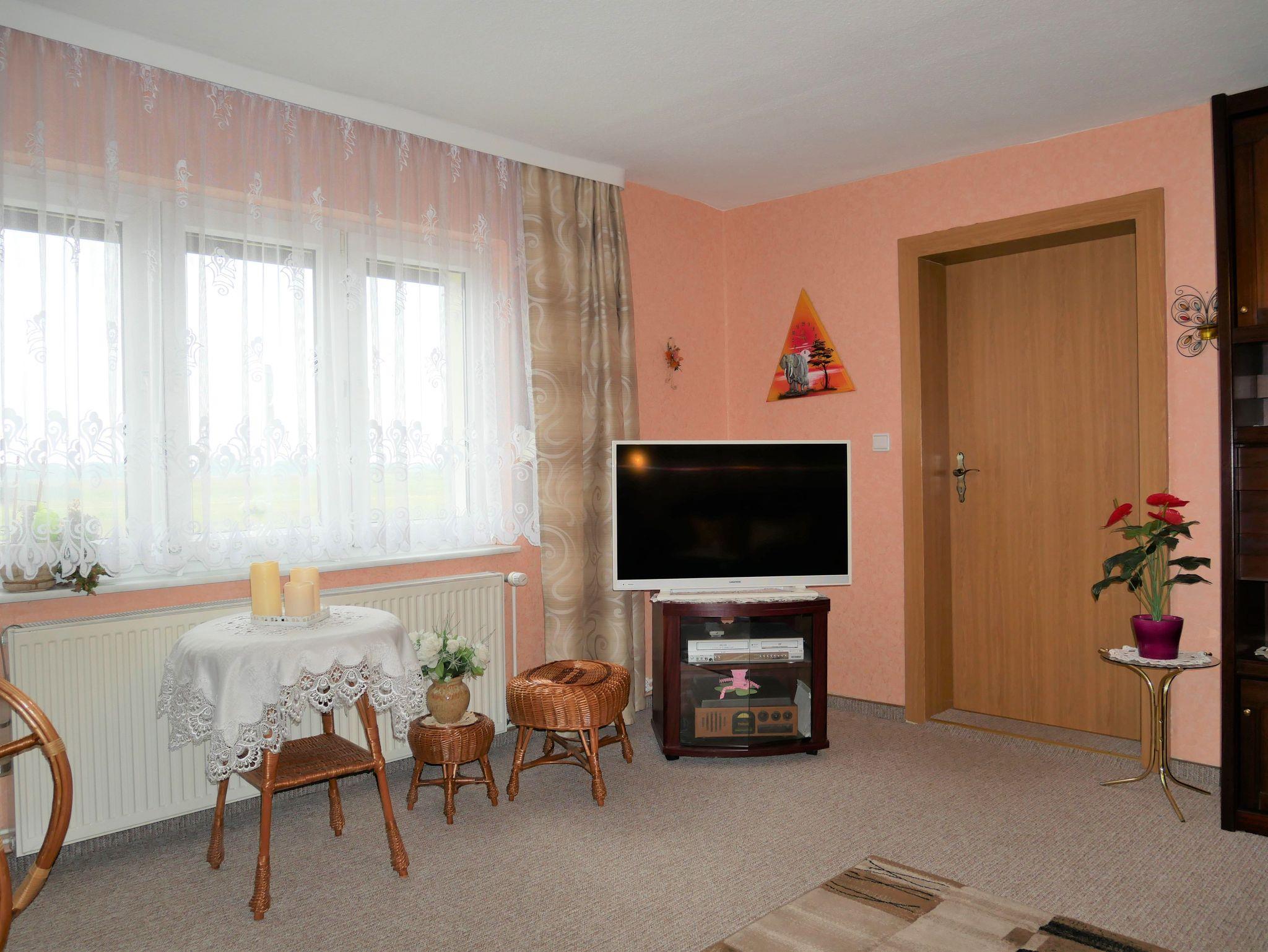Das Wohnzimmer verfügt über einen Flachbild-TV, DVD-Player und ein Schlafsofa. Ebenfalls im Ergeschoss befinden sich das erste Schlafzimmer mit Insektenschutzgitter und das Badezimmer mit einer fast ebenerdigen Dusche.