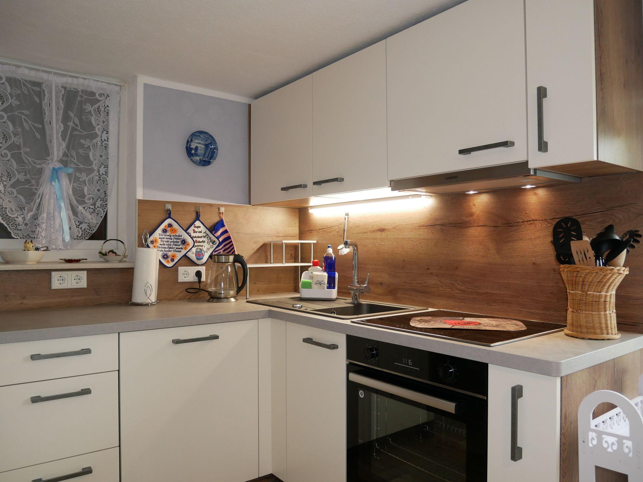 Im Erdgeschoss des Hauses befindet sich eine separate Küche, diese ist voll ausgestattet mit Toaster, Wasserkocher, Kaffeemaschine, Mixer, Kühlschrank mit Tiefkühlfach, Mikrowelle, Herd, Backofen, Spülmaschine und Friteuse.