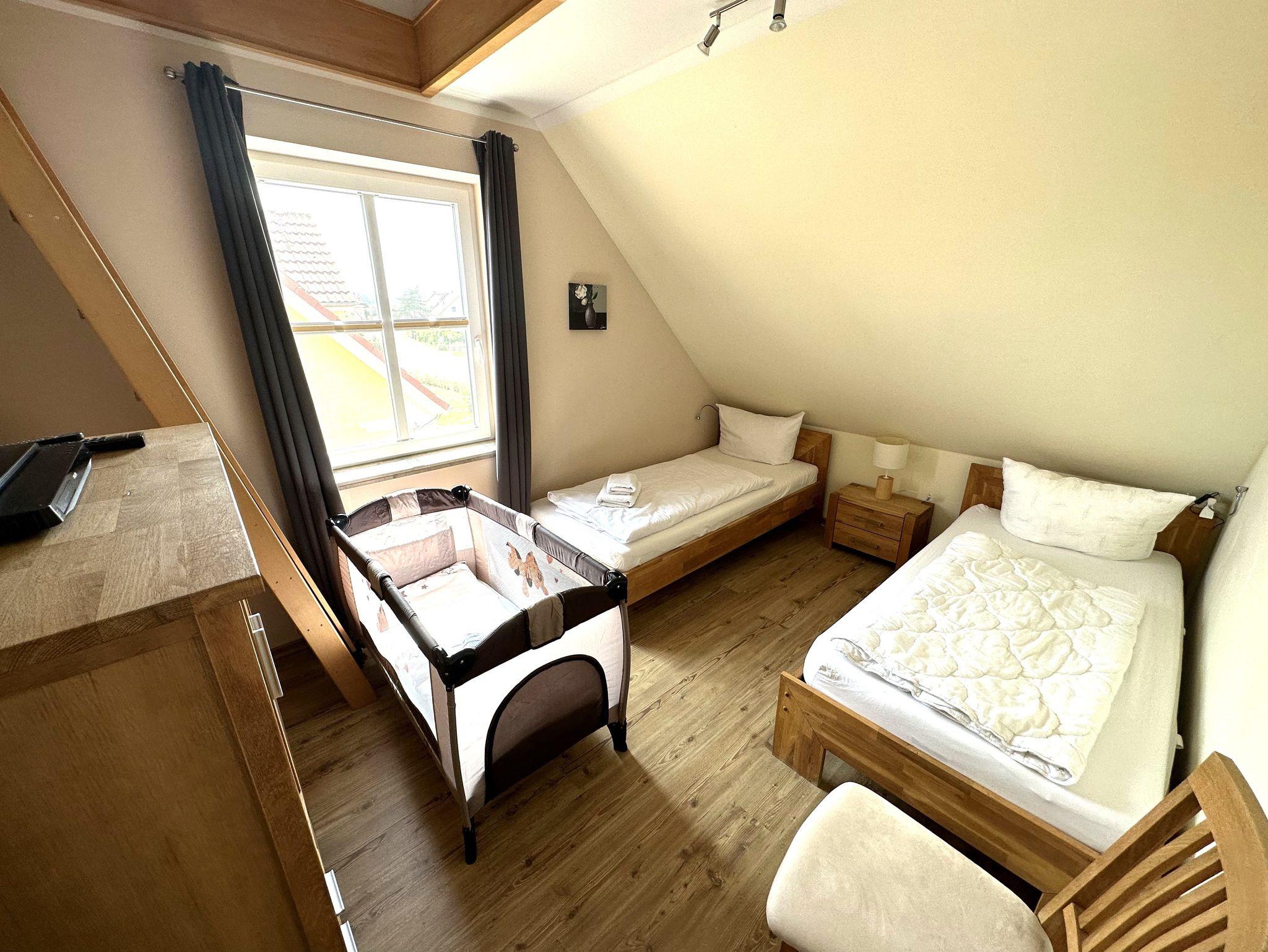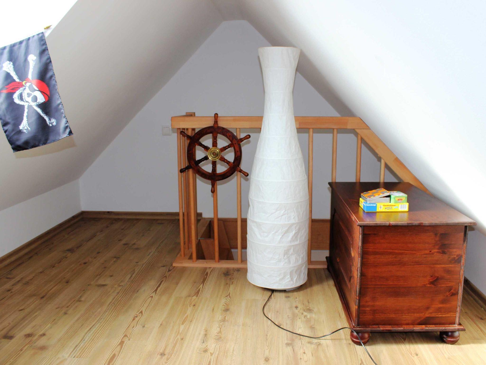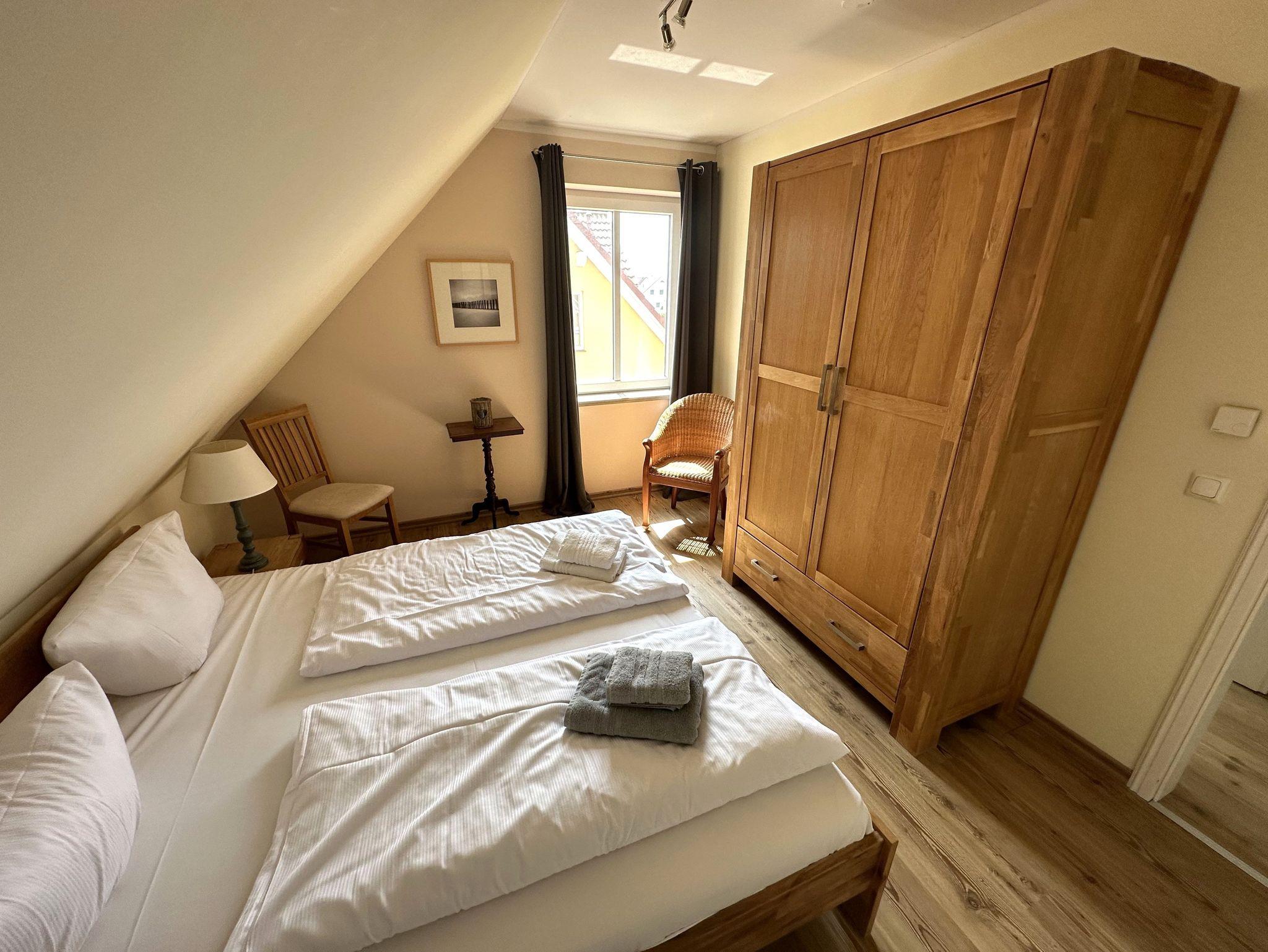 Im Obergeschoss finden Sie zwei separate Schlafzimmer (eins mit Doppelbett und zusätzlichem Flat-TV, eins mit zwei Einzelbetten). Für Kinder kann der Spitzboden zusätzlich noch als Schlafgelegenheit genutzt werden. Hierzu stehen zwei Sessel, die zu Betten ausgeklappt werden können zur Verfügung. Das zweite Badezimmer im OG ist mit Badewanne/WC und Fön ausgestattet.