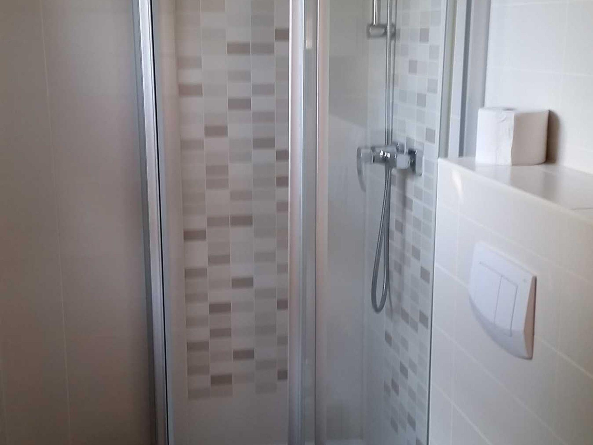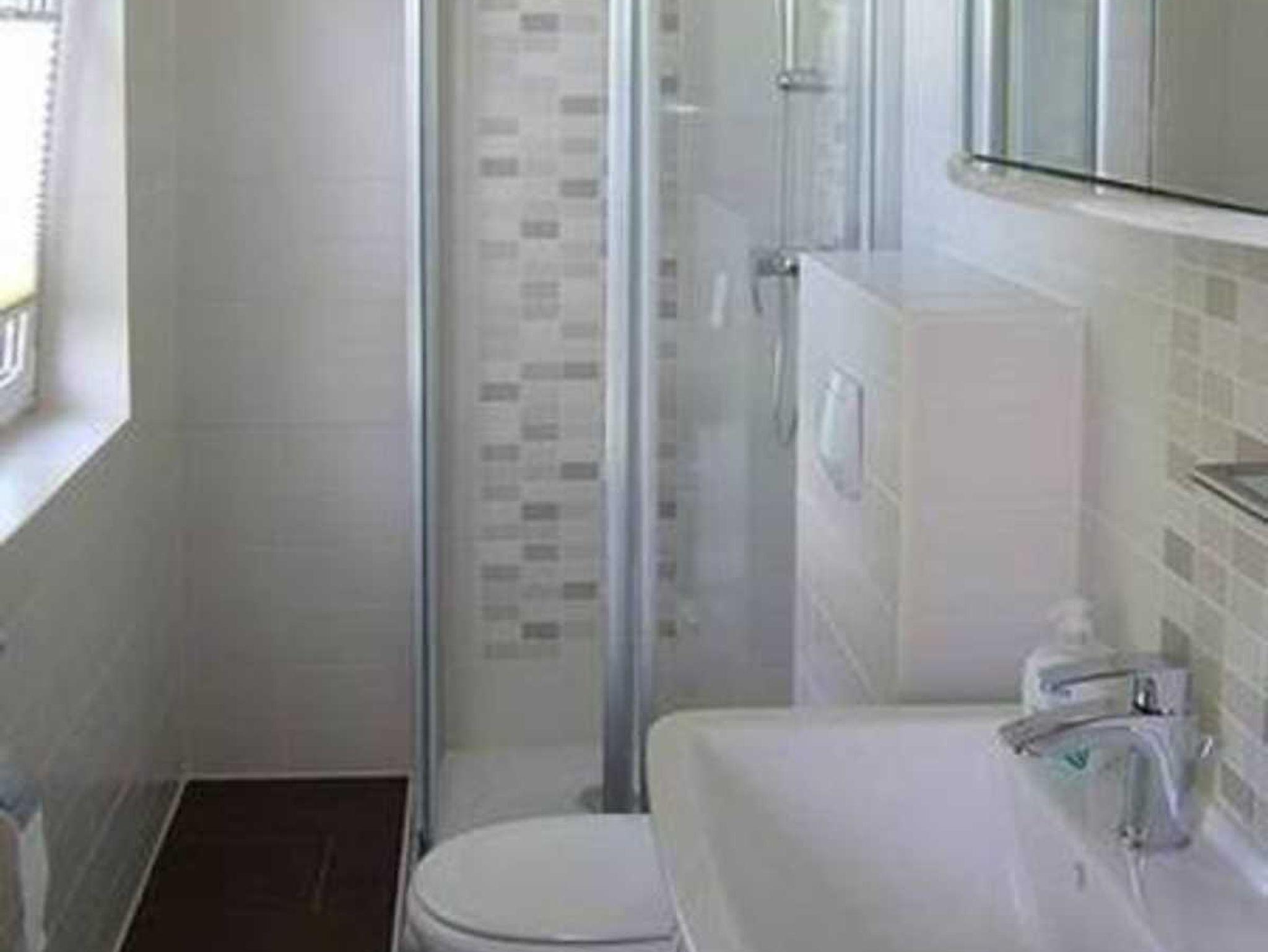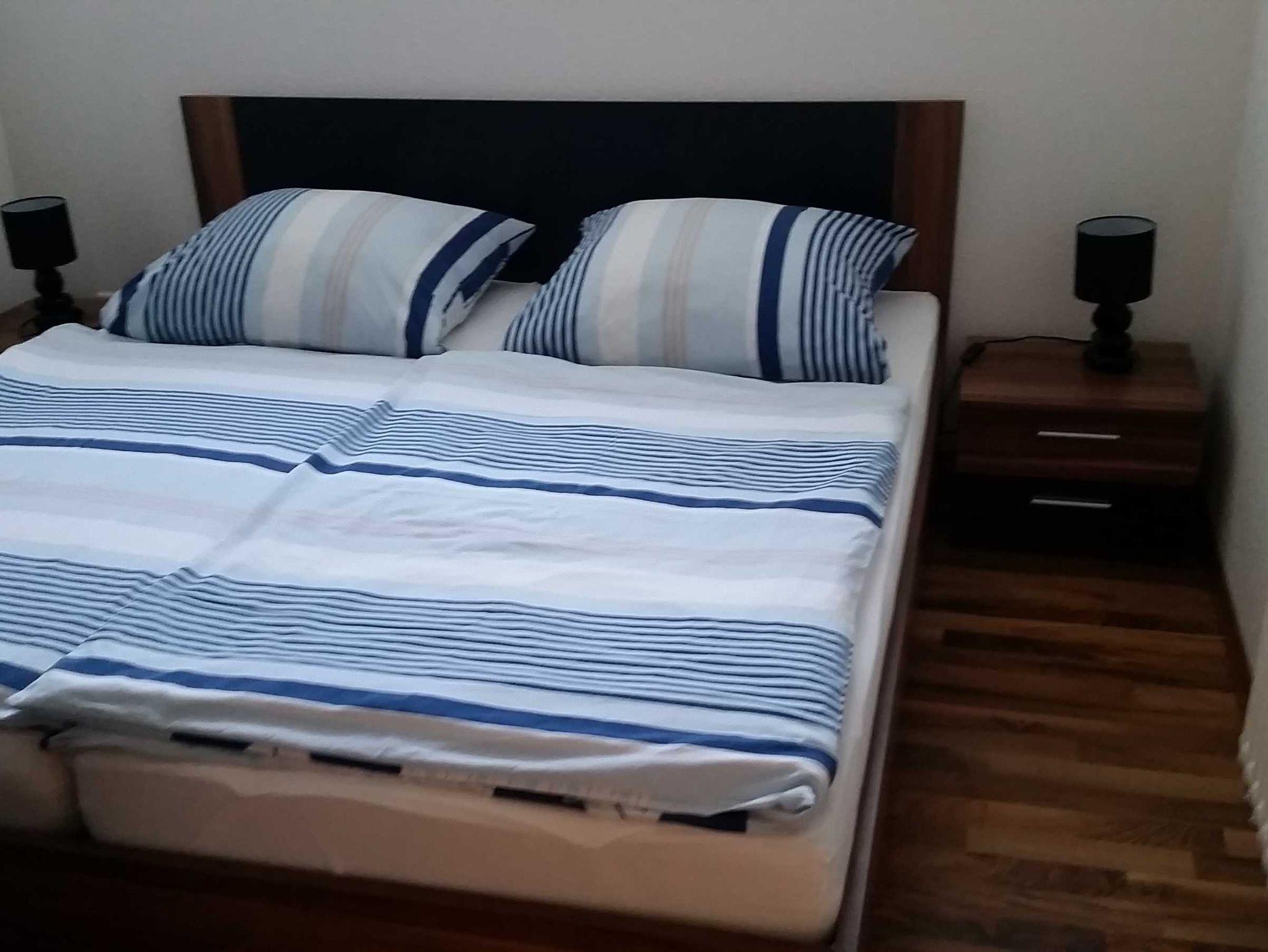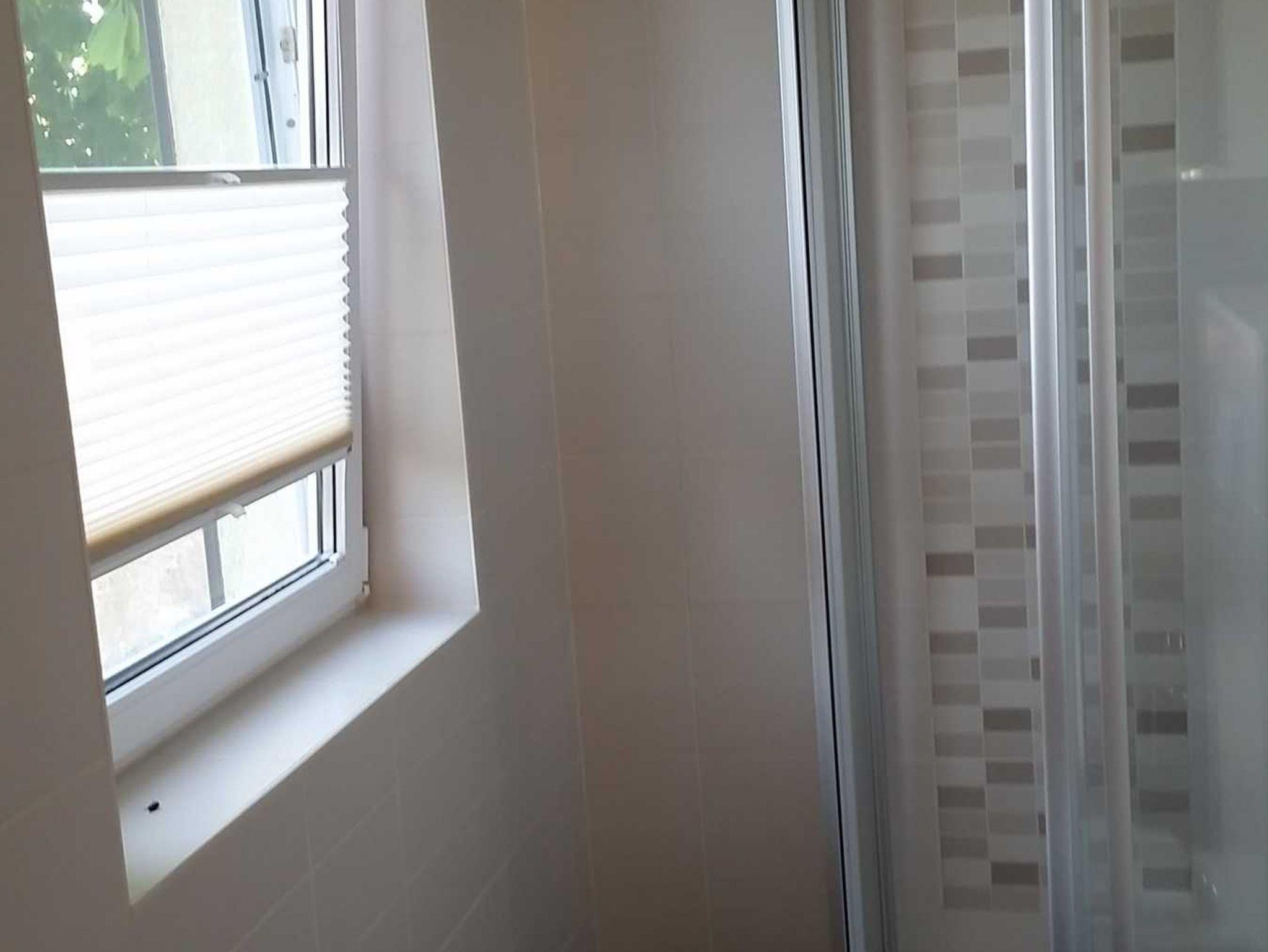 Das Schlafzimmer hat ein Doppelbett und Kleiderschrank. Das Bad mit Fenster, Dusch und WC.Außenrollos und Insektenschutzgitter