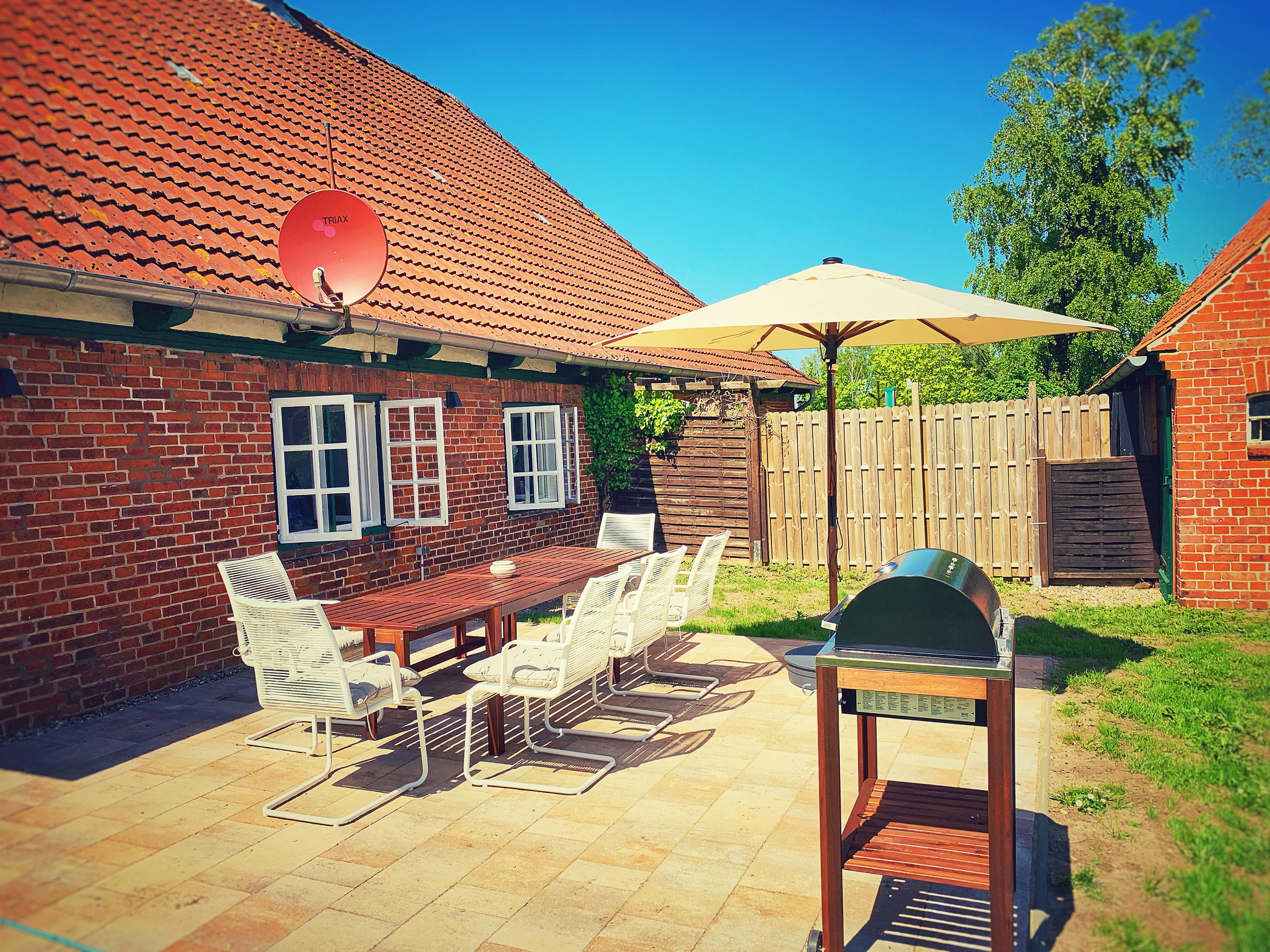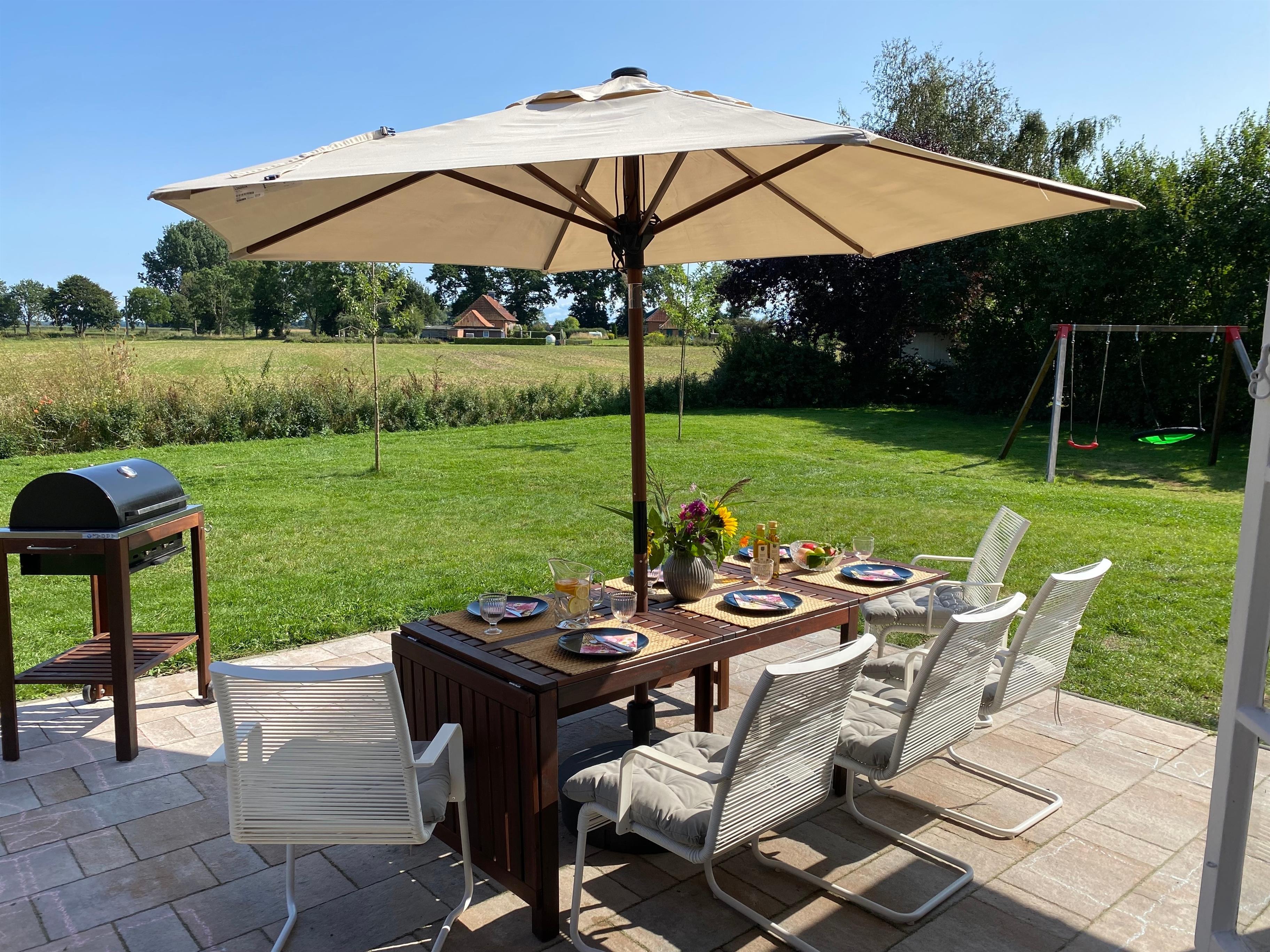 Auf der direkt am Haus gelegenen Terrasse mit Sicht auf Wiesen, Wald und Felder laden Gartenmöbel und Holzkohlegrill zum Verweilen ein und der großzügig angelegte Garten bietet ausreichend Platz für Zwei- und Vierbeiner. Ein Kamin sorgt auch in kälterer Jahreszeit für wohlig warme Atmosphäre.