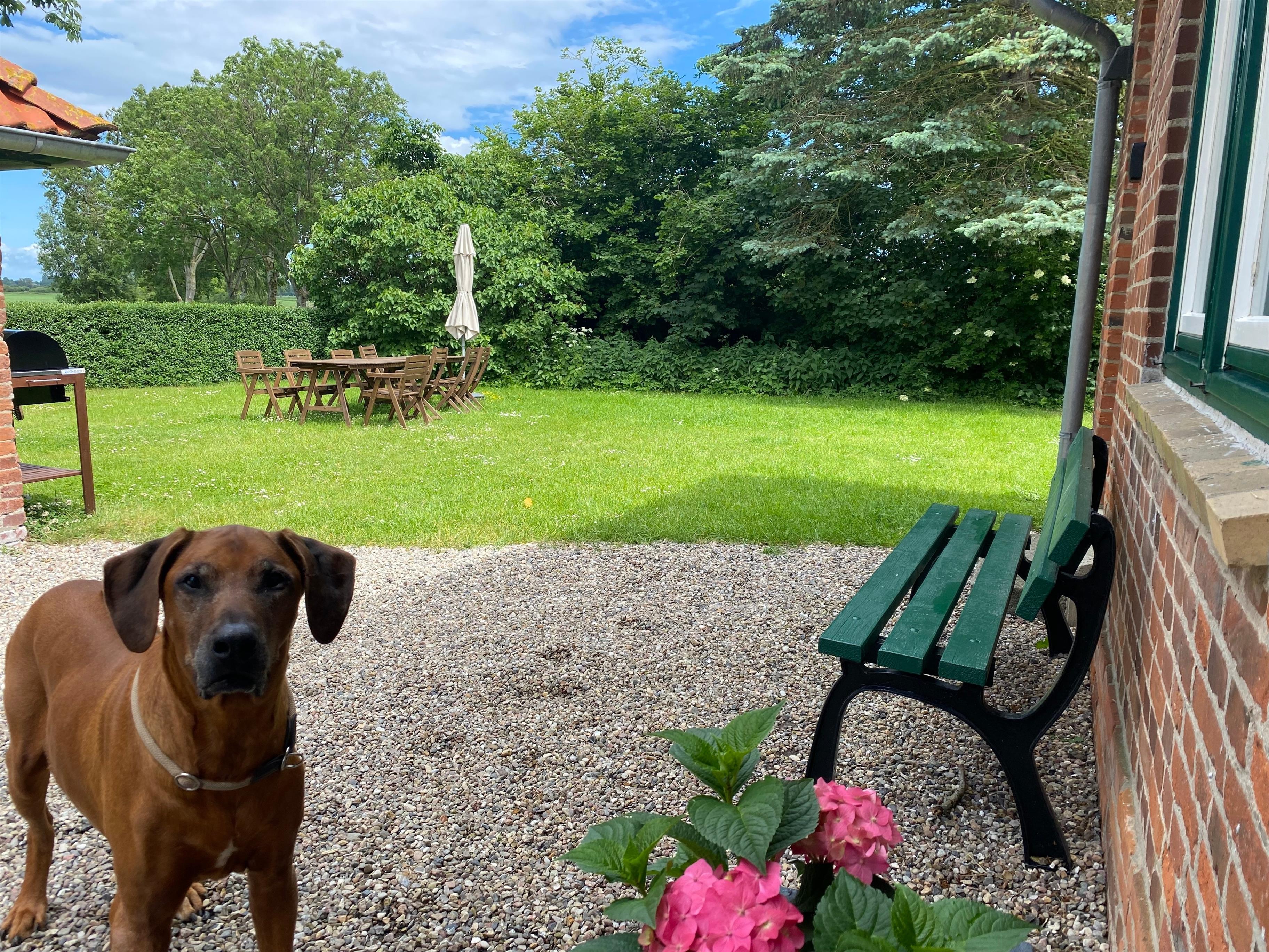 Auf der direkt am Haus gelegenen Terrasse mit Sicht auf Wiesen und Gutsanlage laden Gartenmöbel und Holzkohlegrill zum Verweilen ein und der großzügig angelegte Garten bietet ausreichend Platz für Zwei- und Vierbeiner. Ein Kamin sorgt auch in kälterer Jahreszeit für wohlig warme Atmosphäre.