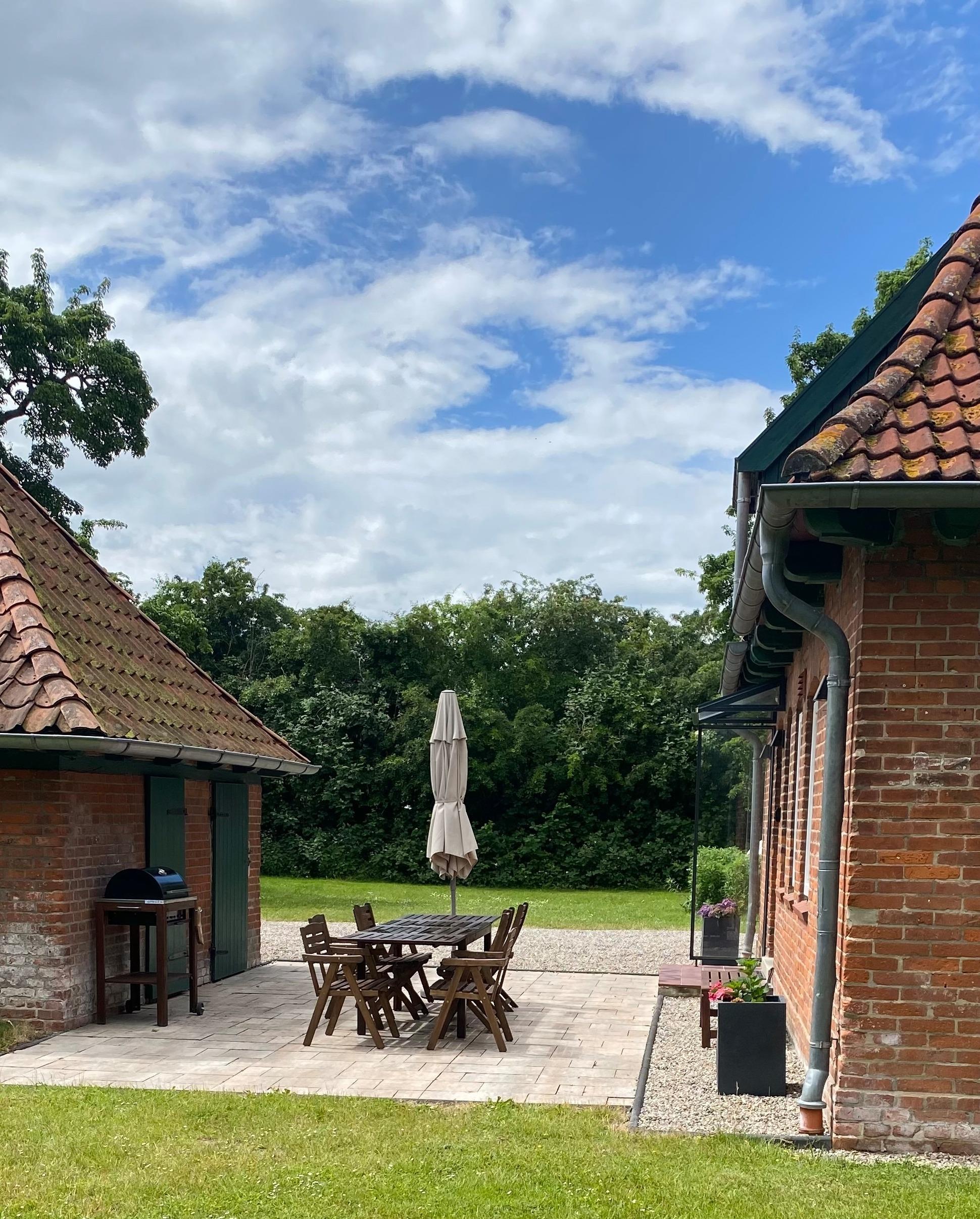 Auf der direkt am Haus gelegenen Terrasse mit Sicht auf Wiesen und Gutsanlage laden Gartenmöbel und Holzkohlegrill zum Verweilen ein und der großzügig angelegte Garten bietet ausreichend Platz für Zwei- und Vierbeiner. Ein Kamin sorgt auch in kälterer Jahreszeit für wohlig warme Atmosphäre.