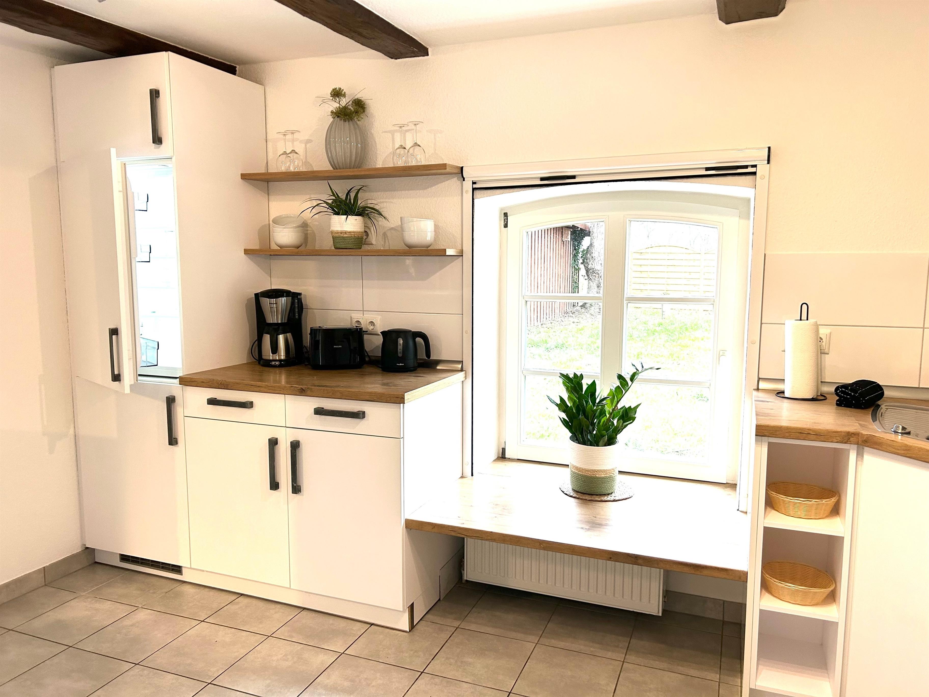 Auf der direkt am Haus gelegenen Terrasse mit Sicht auf Wiesen und Gutsanlage laden Gartenmöbel und Holzkohlegrill zum Verweilen ein und der großzügig angelegte, eingezäunte Garten bietet ausreichend Platz für Zwei- und Vierbeiner. Ein Kamin sorgt auch in kälterer Jahreszeit für wohlig warme Atmosphäre.