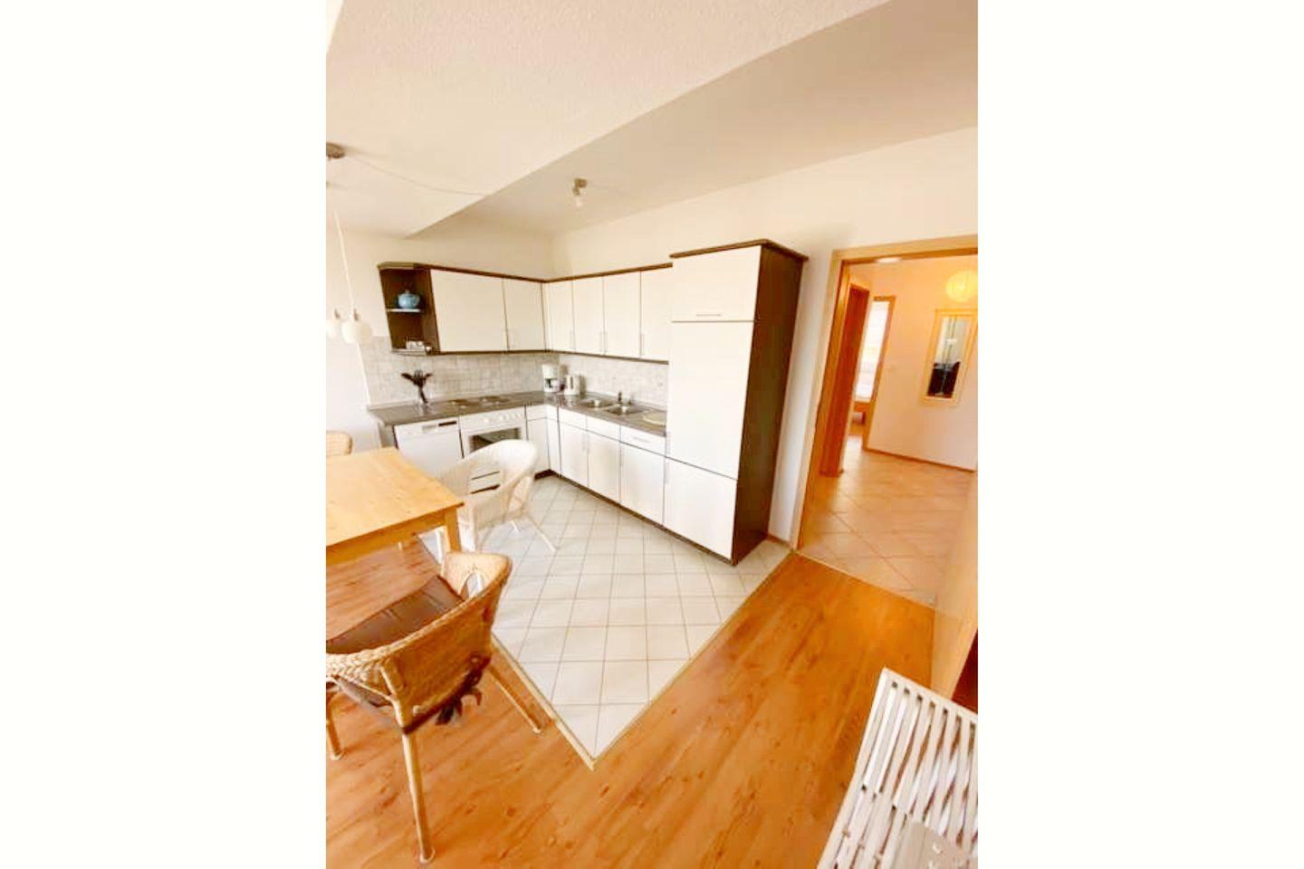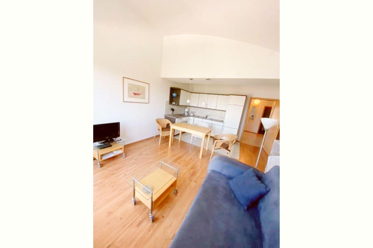 Die Ferienwohnung bietet ein komfortables Schlafzimmer und ein einladendes Wohnzimmer, beide ausgestattet mit hellem Laminatboden. Lassen Sie sich vom Licht der großen Fenster verzaubern und genießen Sie den Blick auf die grüne Umgebung. Ein Balkon lädt dazu ein, die frische Ostseeluft zu genießen und romantische Abende zu verbringen. Die offene Küche ist voll ausgestattet und lässt keine Wünsche offen: Ein Herd mit vier Platten, ein Backofen, eine Spülmaschine sowie ein Kühlschrank mit Gefrierfach garantieren, dass Sie Ihre Lieblingsgerichte mühelos zubereiten können. Der Essbereich ist perfekt für gesellige Mahlzeiten.