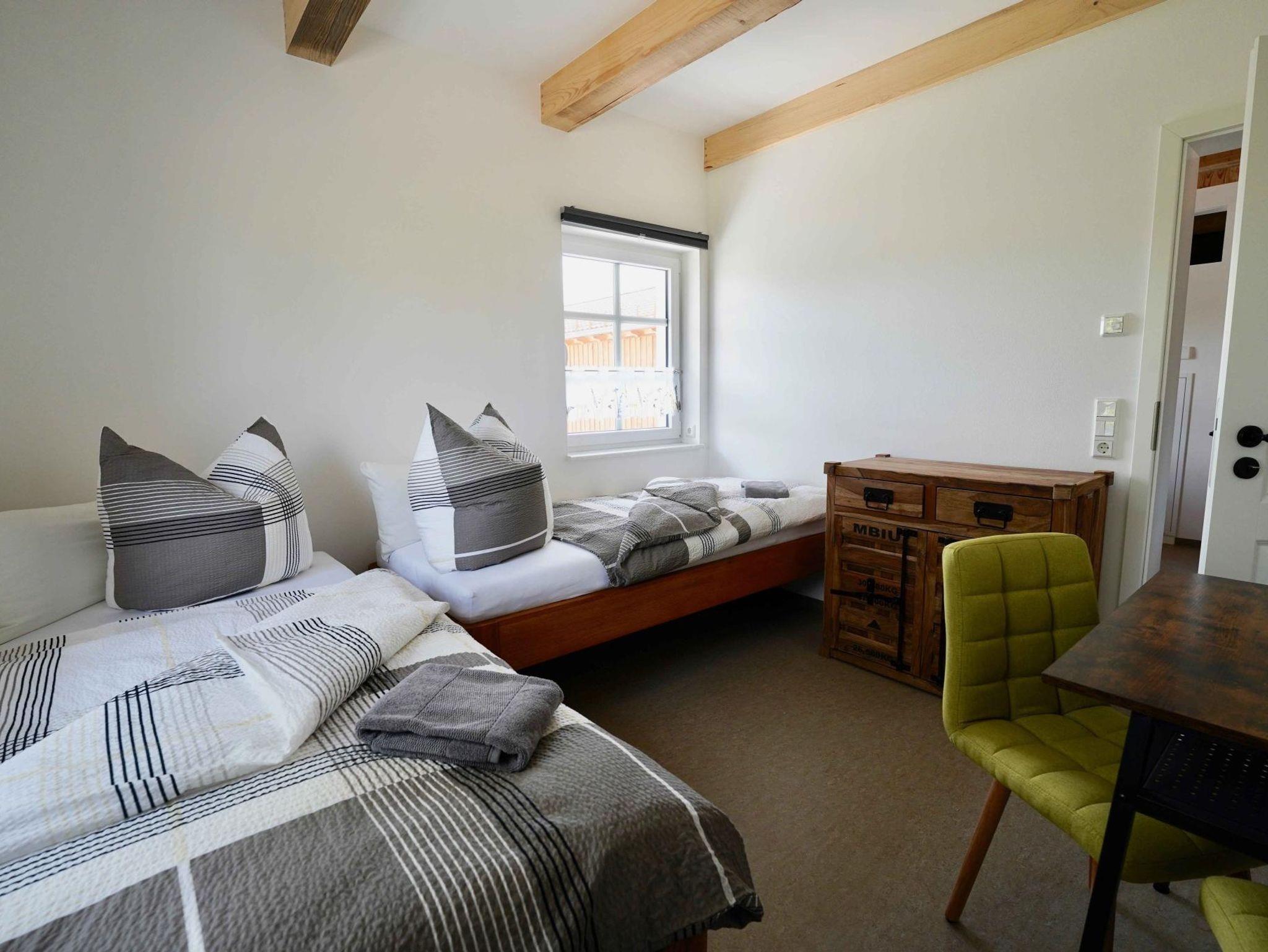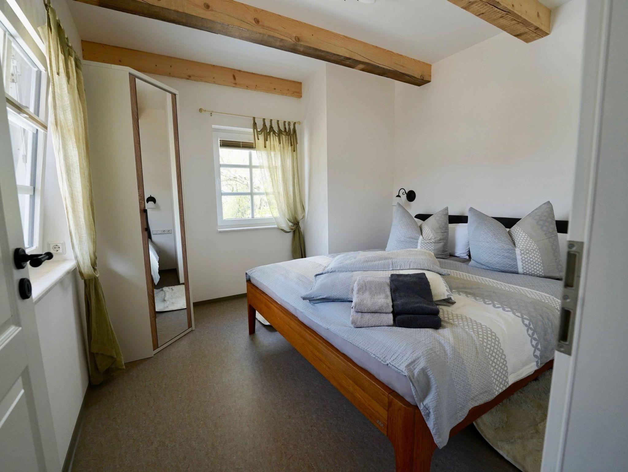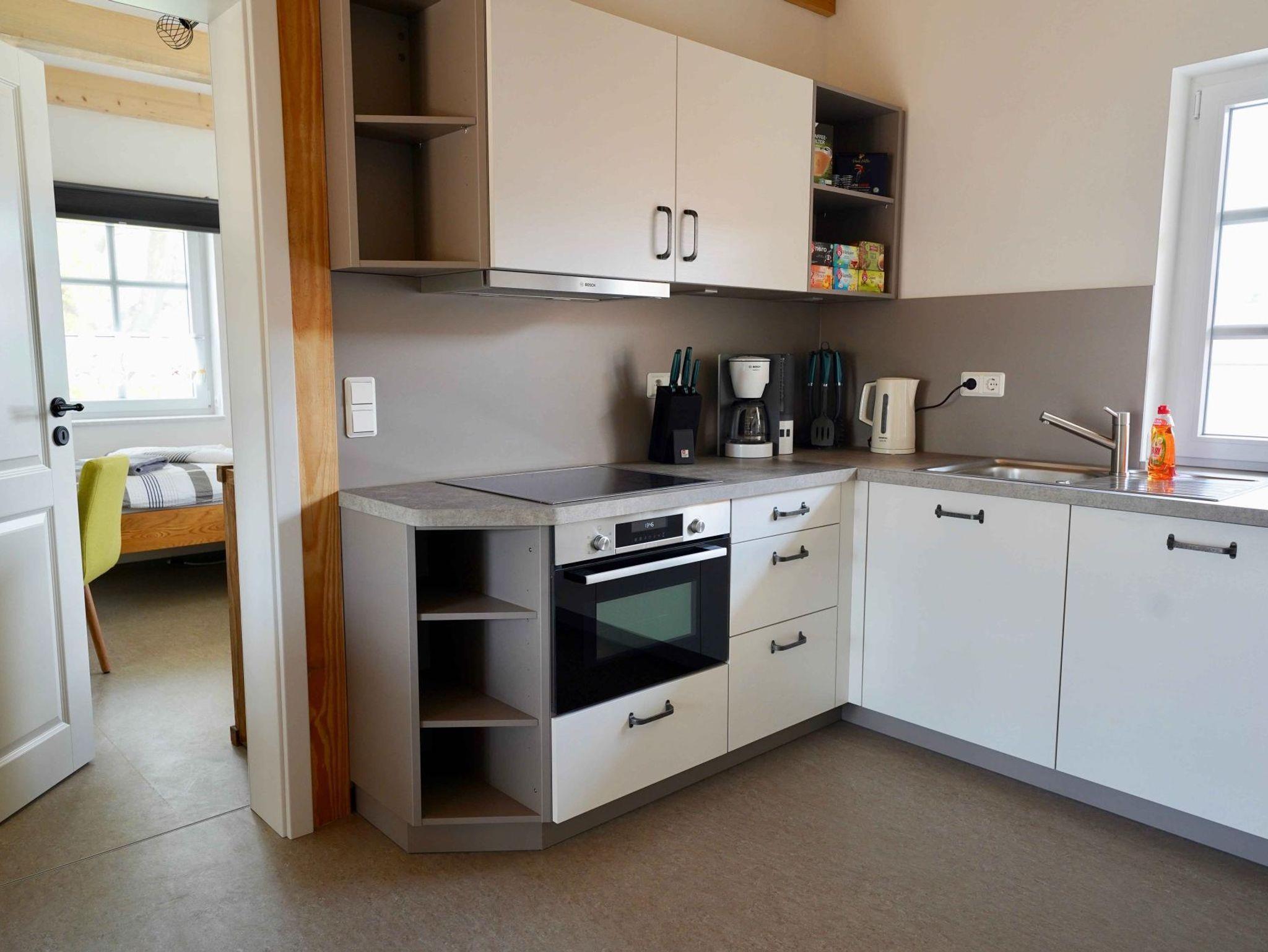 Diese familienfreundliche Ferienwohnung verfügt über eine geräumige und vollausgestatte Wohnküche. Die Wohnung besitzt ein Elternschlafzimmer mit Doppelbett und ein Kinderzimmer mit zwei Einzelbetten und das großen Ecksofa in Wohnbereich lädt zum Verweilen ein. Eine Fachwerkwand und Holzbalkendecke lassen die Räume sehr gemütlich wirken. Das Badezimmer ist mit einer ebenerdigen Dusche, WC, Waschtischschrank und beleuchteten Spiegel ausgestattet. Weiter gibt es einen Essbereich, einen Flurbereich mit nostalgischer Garderobenecke, sowie einen Balkon, auf welchen man die untergehende Abendsonne genießen kann. In der Ferienwohnung sind außerdem der Bettwäsche- und Handtuchservice sowie der Kaffee und eine kleine Tee-Auswahl in der Küche, als Service inbegriffen. Eine Flasche Mineralwasser als Begrüßungsgetränk und die Endreinigung nach dem Check Out gehören ebenfalls standardmäßig zu unserem Service.