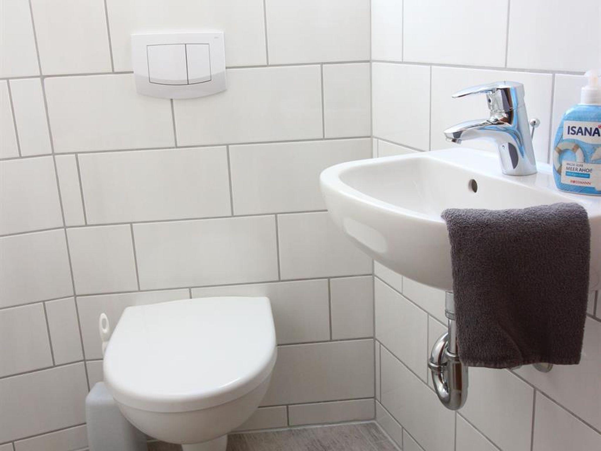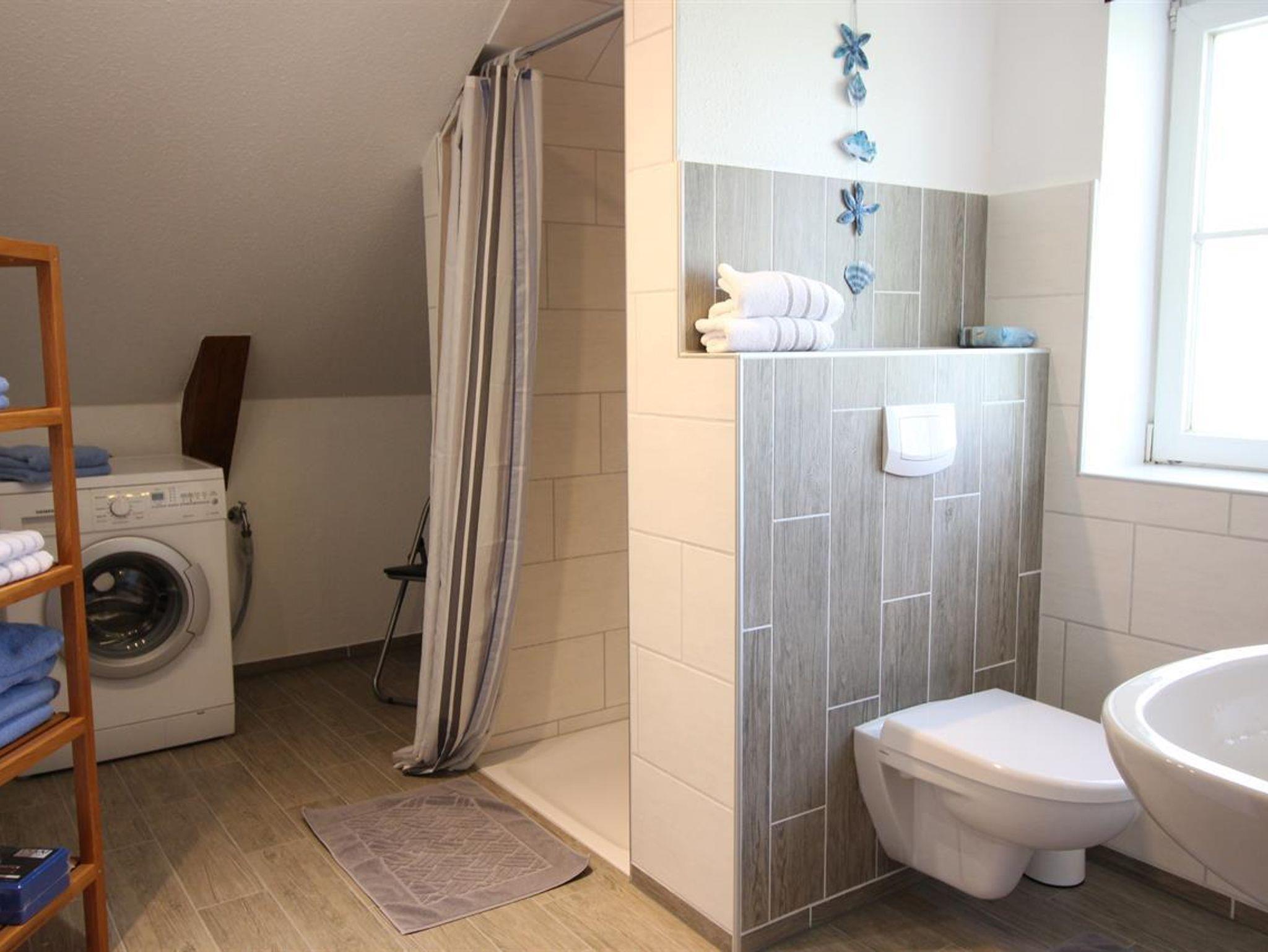 Das Badezimmer ist mit einer Dusche, Waschmaschine, Waschtisch und WC ausgestattet. Ein separates WC ist vorhanden.