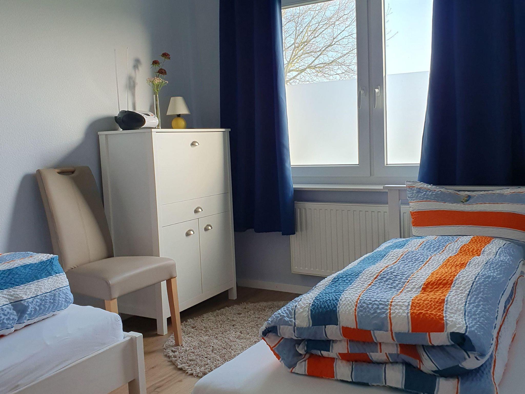 Ein Schlafzimmer mit Doppelbett und ein Schlafzimmer mit 2 Einzelbetten runden die gemütliche und in angenehmen Farben eingerichtete Wohnung ab.