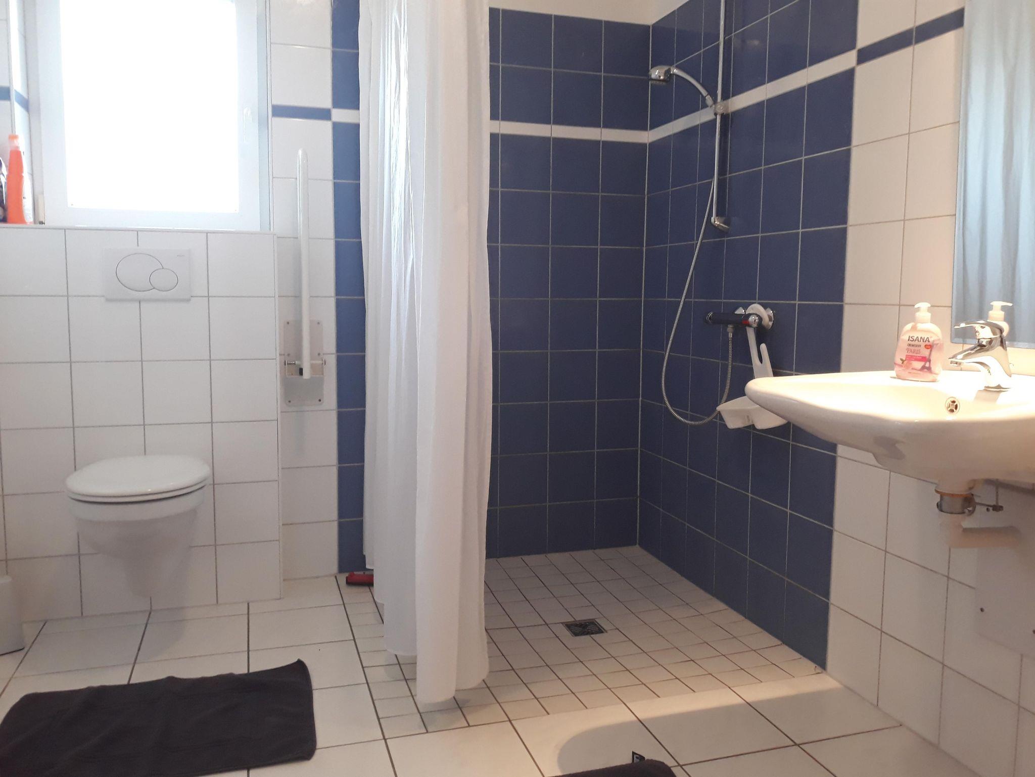 gelangen Sie auf die sonnige Terrasse. Das Duschbad ist mit einer ebenerdigen Dusche, Waschtisch und WC ausgestattet.