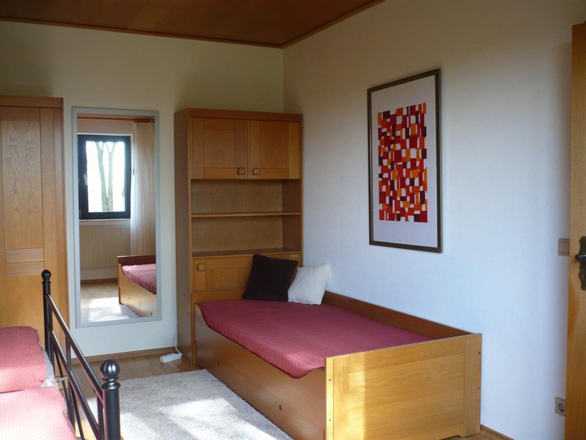 Das Schlalfzimmer ist ausgestattet mit einem Doppelbett (1,80 m x 2,00 m), Beistellbett (0,90 m x 2,00 m), 2-türiger Kleiderschrank, Ganzkörperspiegel, Nachtkonsolen, Schranktresor etc. .