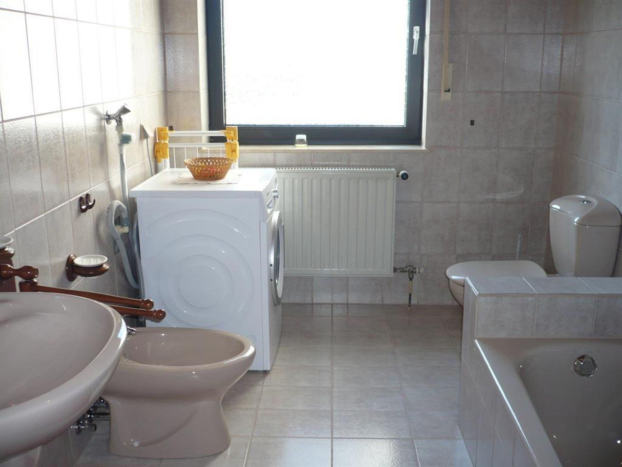 Das Bad ist ausgestattet mit Dusche, Badewanne, Waschbecken, WC, Bidet und Waschmaschine. Zur Ausstattung gehören auch ein Fön, ein klappbarer Wäscheständer, Handtücher sowie auf Wunsch 2 Bademäntel.